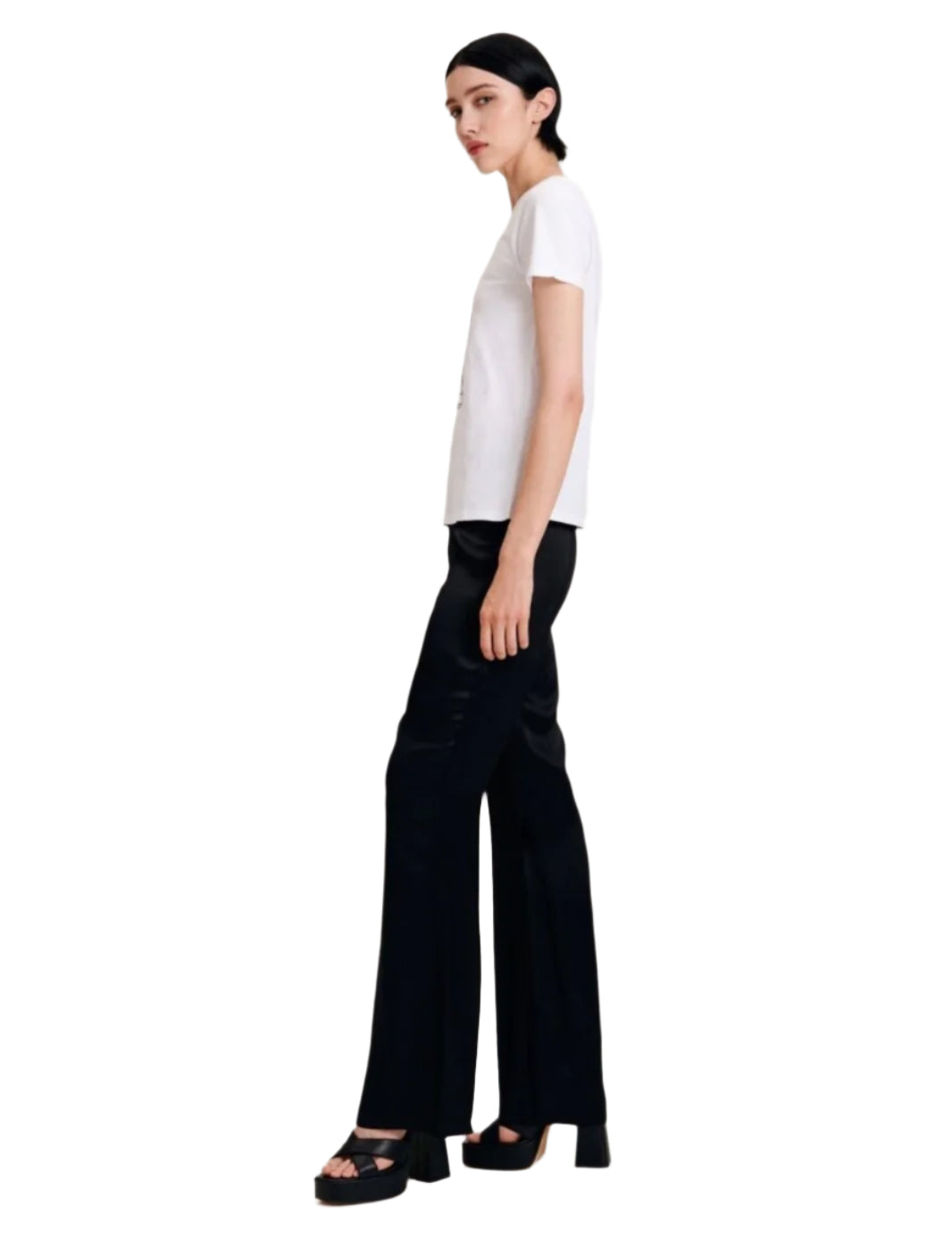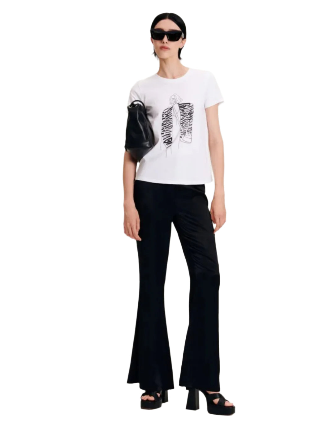 Címke nélküli, női trapéznadrág, fekete színű, magas derekú, testhezálló fazon a comboknál, enyhén bővülő szárral, elegáns és trendi viselet hétköznapokra vagy alkalmi megjelenéshez.