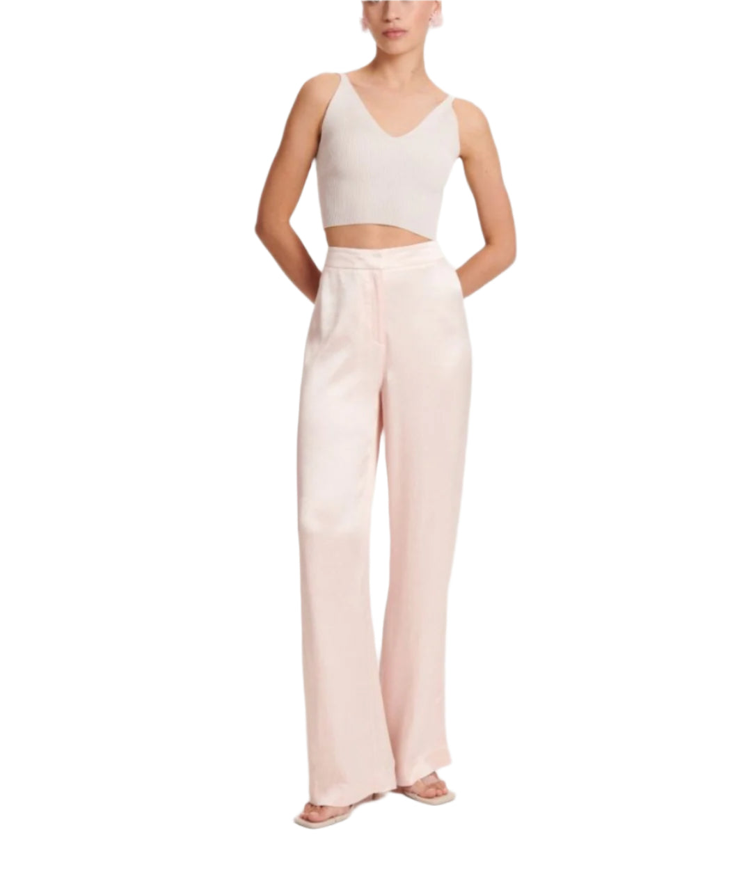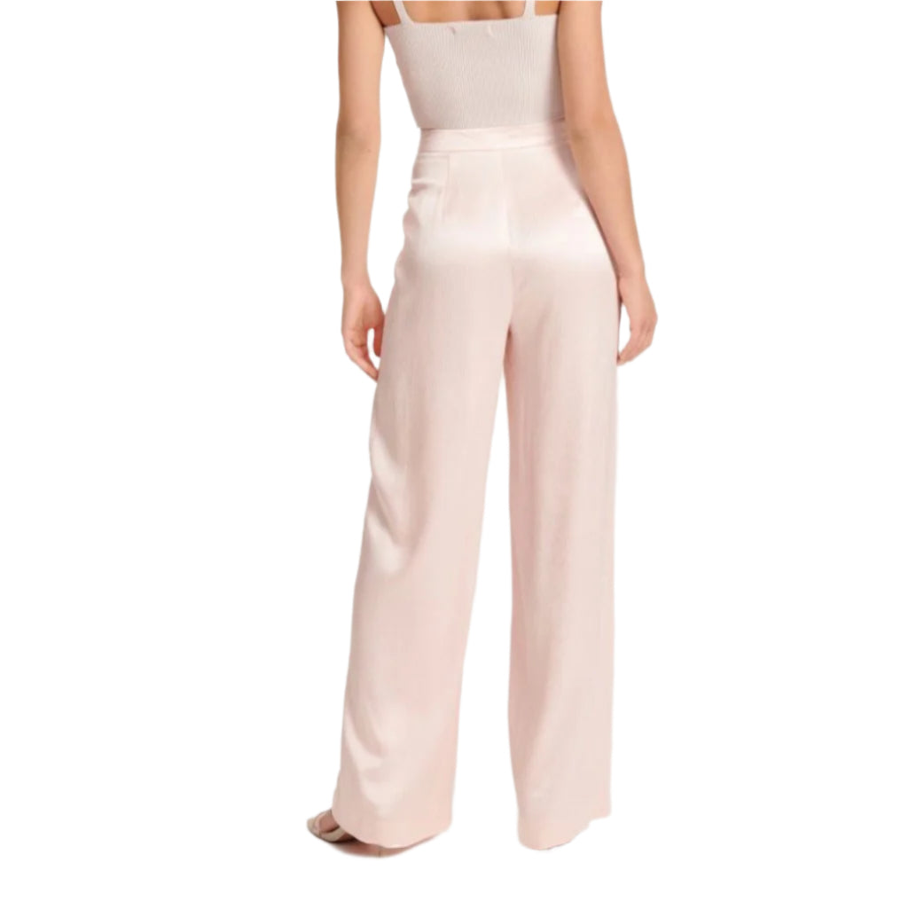 Címke nélküli, női elegáns nadrág, halvány rózsaszín színű, magas derekú, bő szárú fazon, fényes szatén anyagból, könnyed és kifinomult viselet alkalmi eseményekre vagy elegáns megjelenéshez.