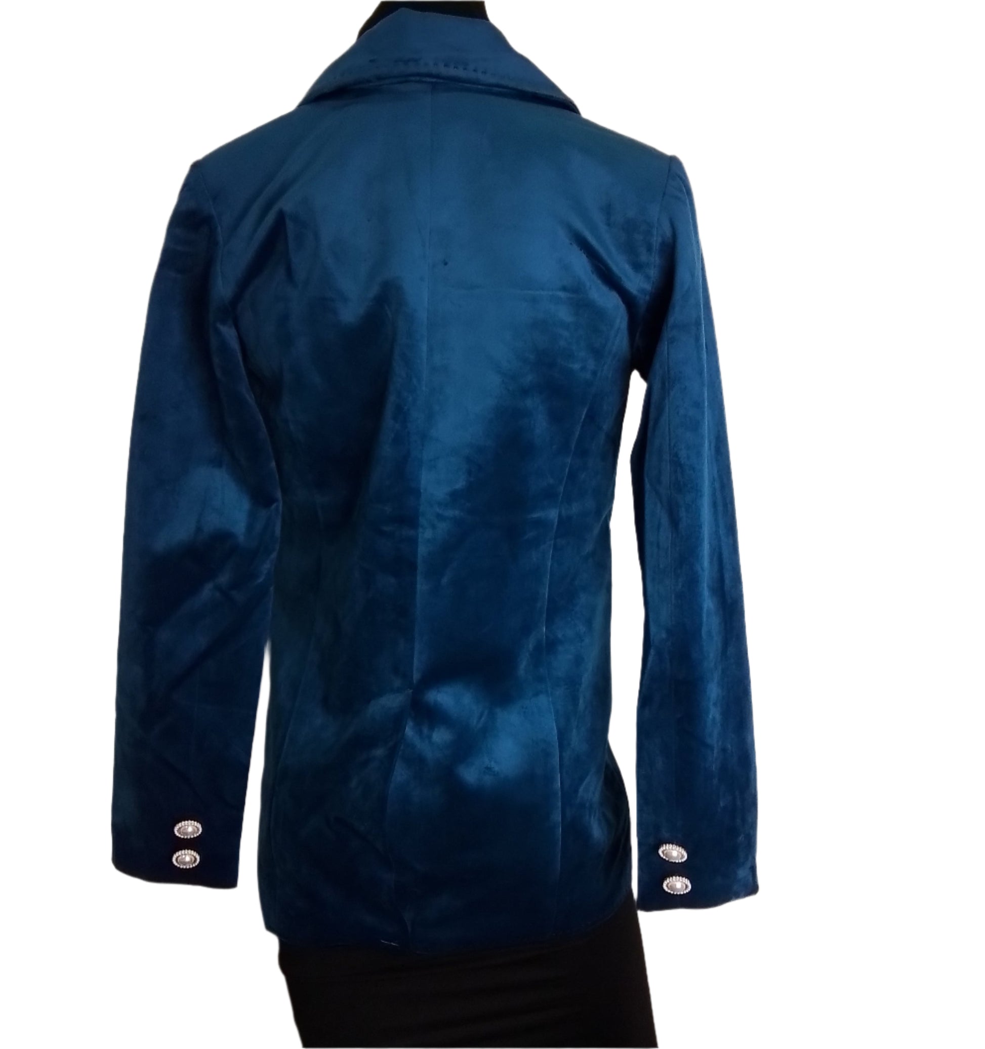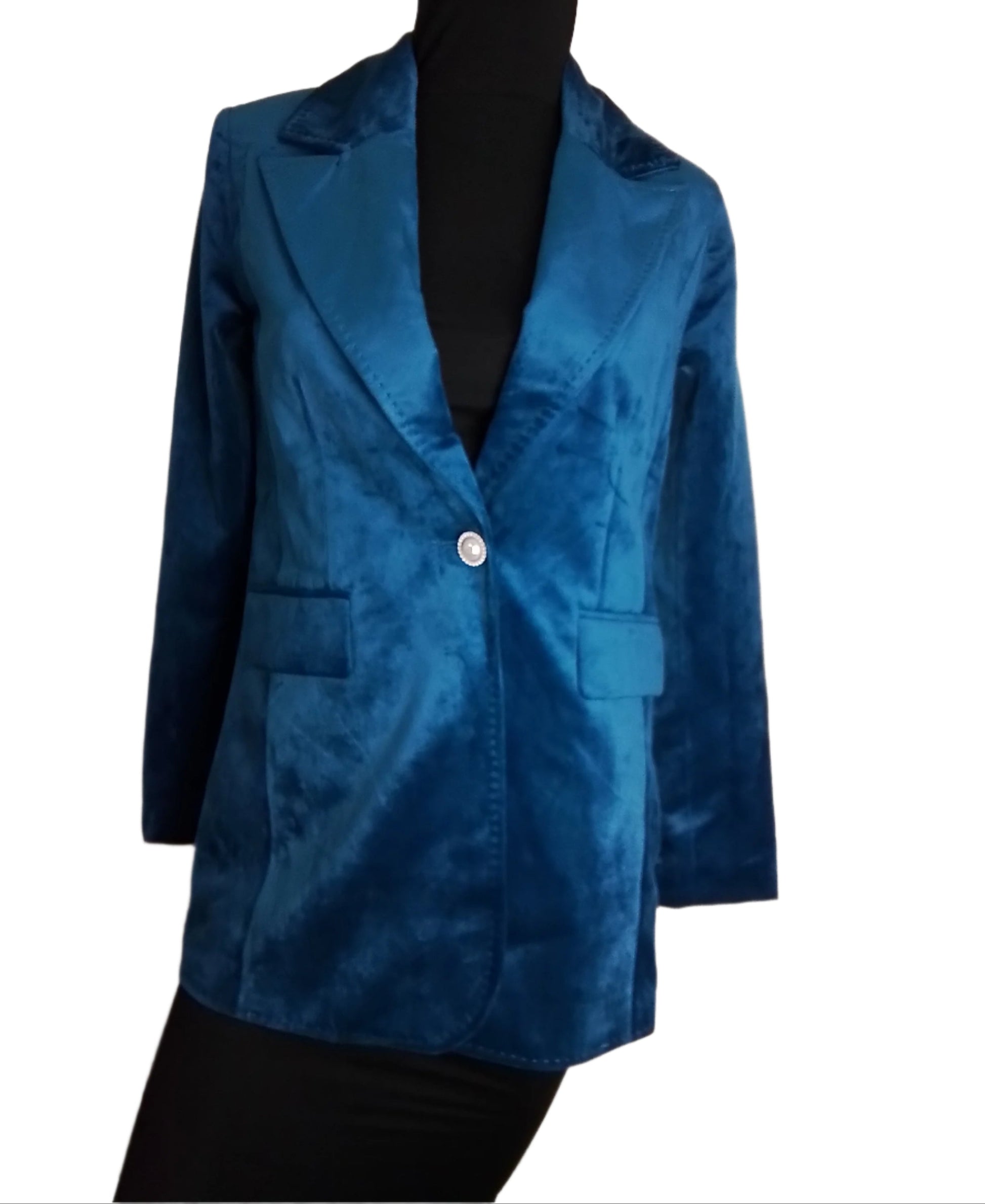 Címke nélküli, elegáns kék bársony blézer, amely luxus megjelenést és kényelmet biztosít. Klasszikus fazonját egygombos záródás és két praktikus oldalzseb egészíti ki. Puha tapintású anyaga tökéletes választás alkalmi és elegáns szettekhez.