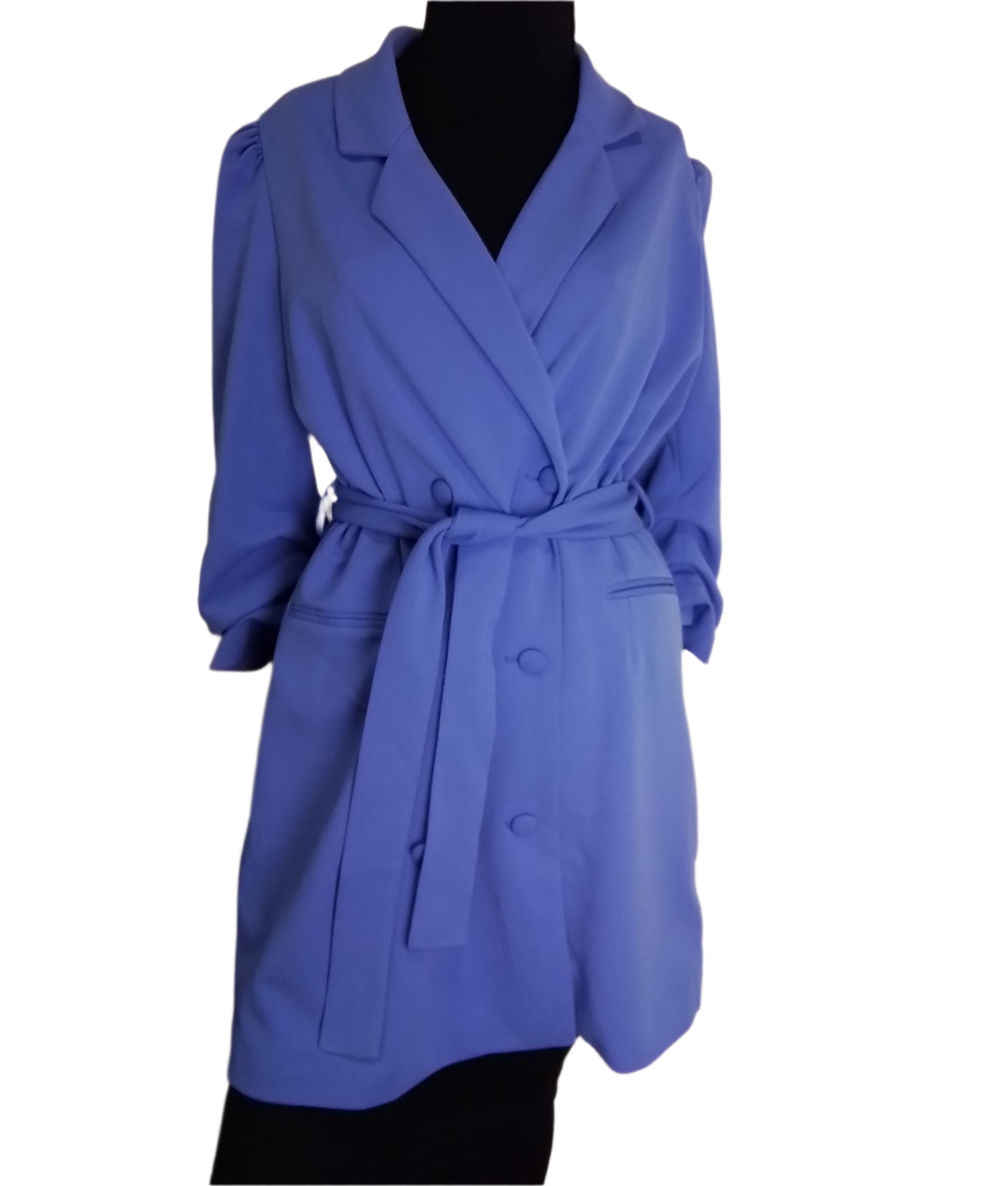 Címke nélküli, kék hosszított blézer megkötős derékrésszel. Duplasoros gombolás és klasszikus galléros kialakítás teszi elegánssá. A laza szabás és az enyhén puffos ujjak különleges megjelenést kölcsönöznek. Tökéletes választás alkalmi és hétköznapi viselethez egyaránt.