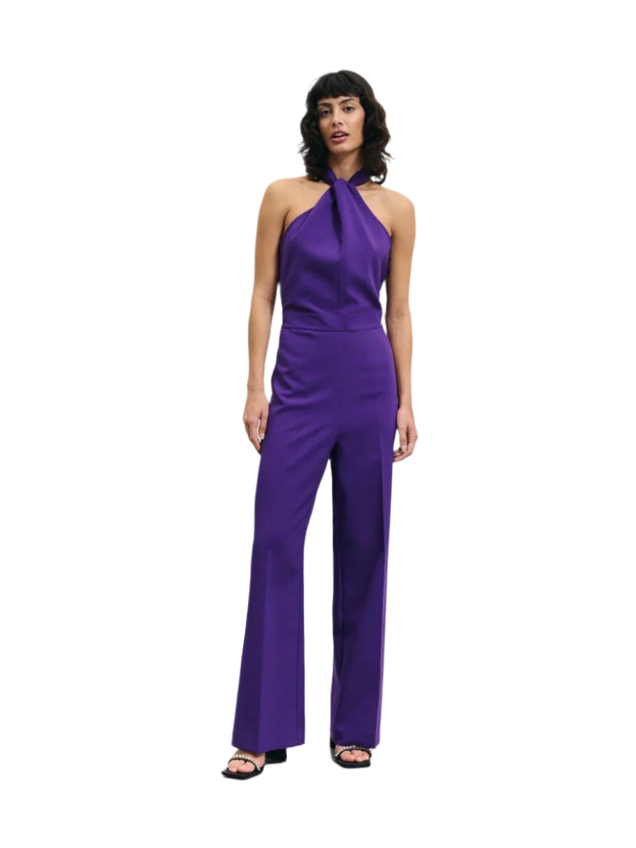 Címke nélküli, elegáns lila overál, magas nyakú, megköthető pánttal és ujjatlan kialakítással. Testhezálló felsőrésszel és egyenes szárú nadrágrésszel, amely kiemeli az alakot. Tökéletes választás alkalmi eseményekre, estélyekre vagy elegáns megjelenéshez.