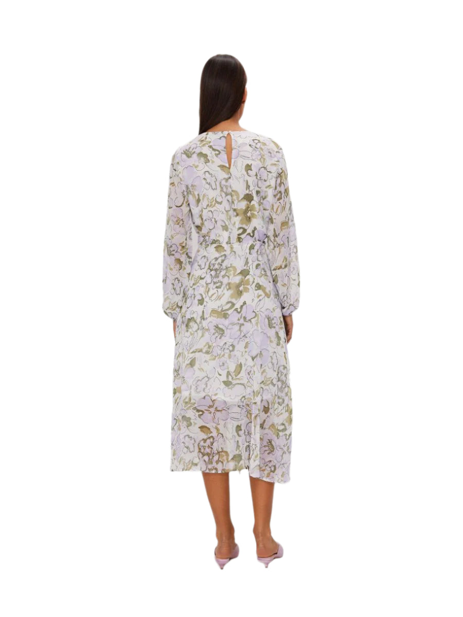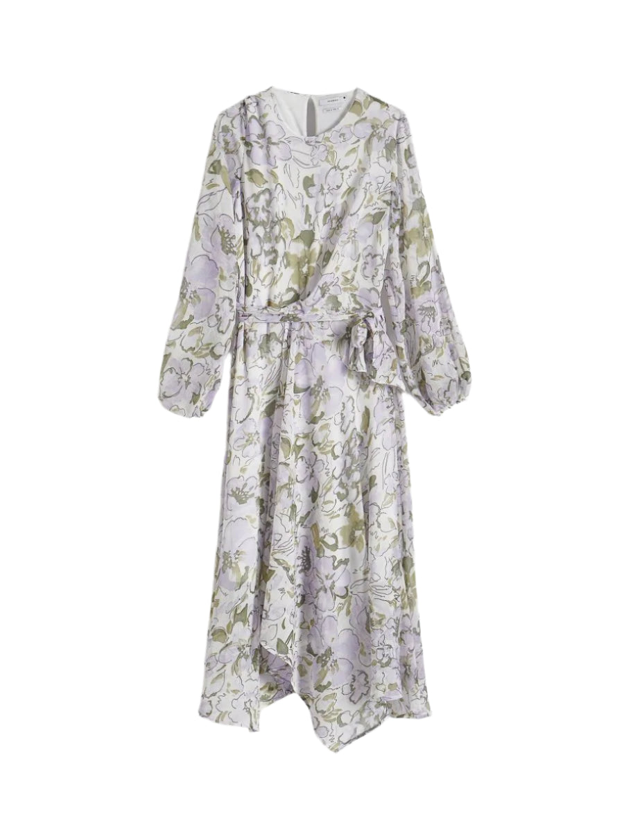 Címke nélküli, virágmintás, hosszú fazonú ruha. Könnyed, légies anyagból készült, amely kényelmes viseletet biztosít. Hosszú ujjú, átlapolt V-kivágással és derékon megköthető övvel rendelkezik, amely kiemeli az alakot. Aszimmetrikus szegélye elegáns megjelenést kölcsönöz. Tökéletes választás alkalmi eseményekre vagy tavaszi-nyári hétköznapokra.