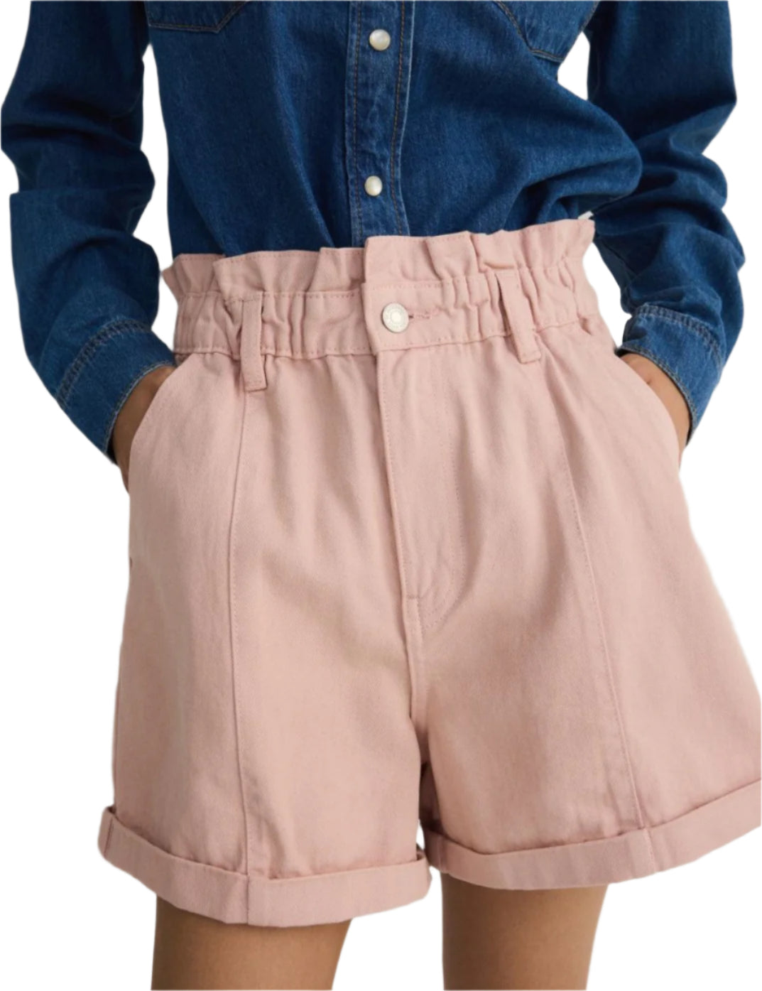 Címke nélküli, magas derekú farmer rövidnadrág. Gumis derékrésszel és övbújtatókkal a kényelmes illeszkedés érdekében. Kifordított szegéllyel és elülső zsebekkel rendelkezik. Vastagabb, strapabíró anyaga miatt ideális hétköznapi viseletre.