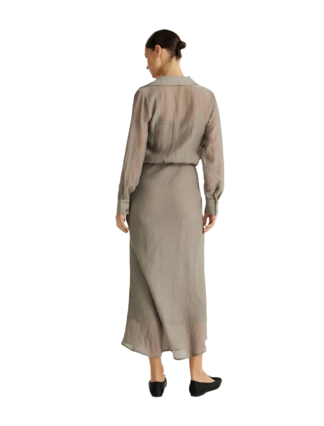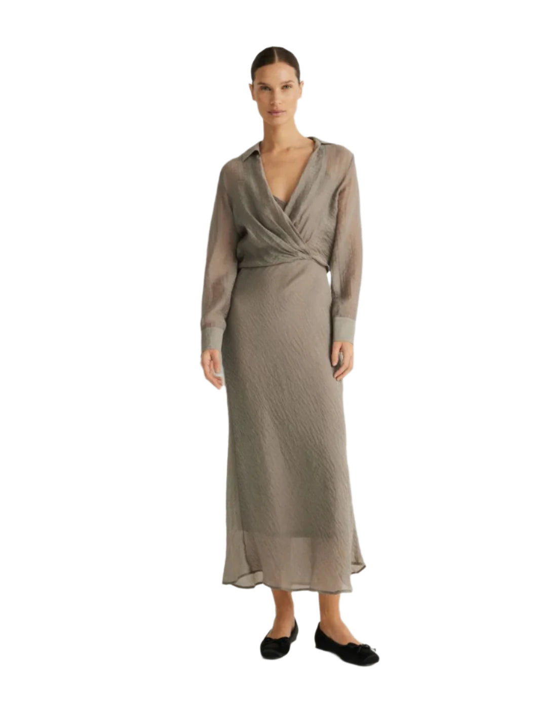 Címke nélküli, elegáns szürkésbarna hosszú ruha. Átlapolt V-kivágású felsőrésszel és finoman átlátszó, hosszú ujjakkal. Kényelmes, könnyed esésű anyag, amely kiemeli a nőies vonalakat. Tökéletes választás alkalmi eseményekre vagy elegáns hétköznapi viseletként.