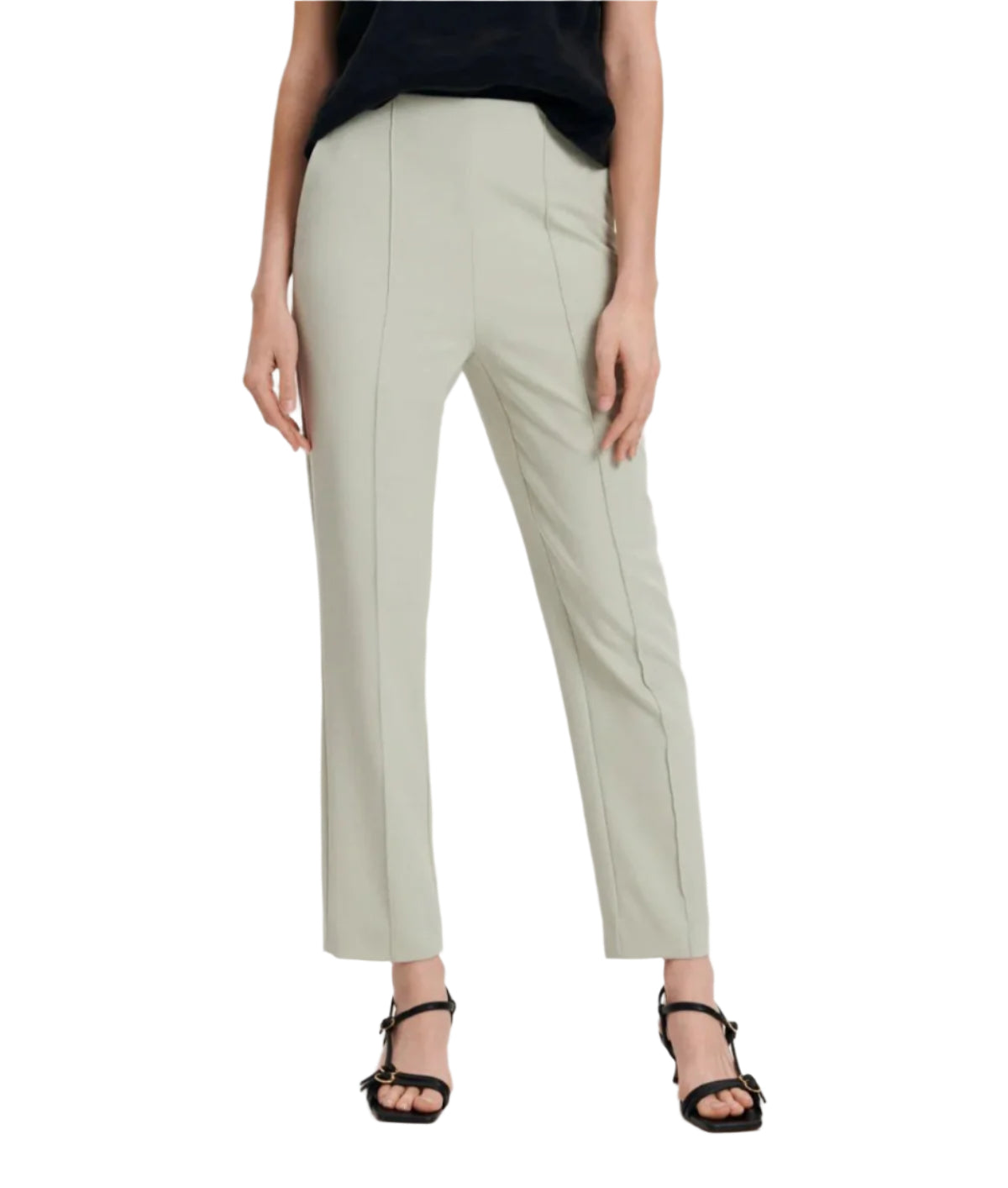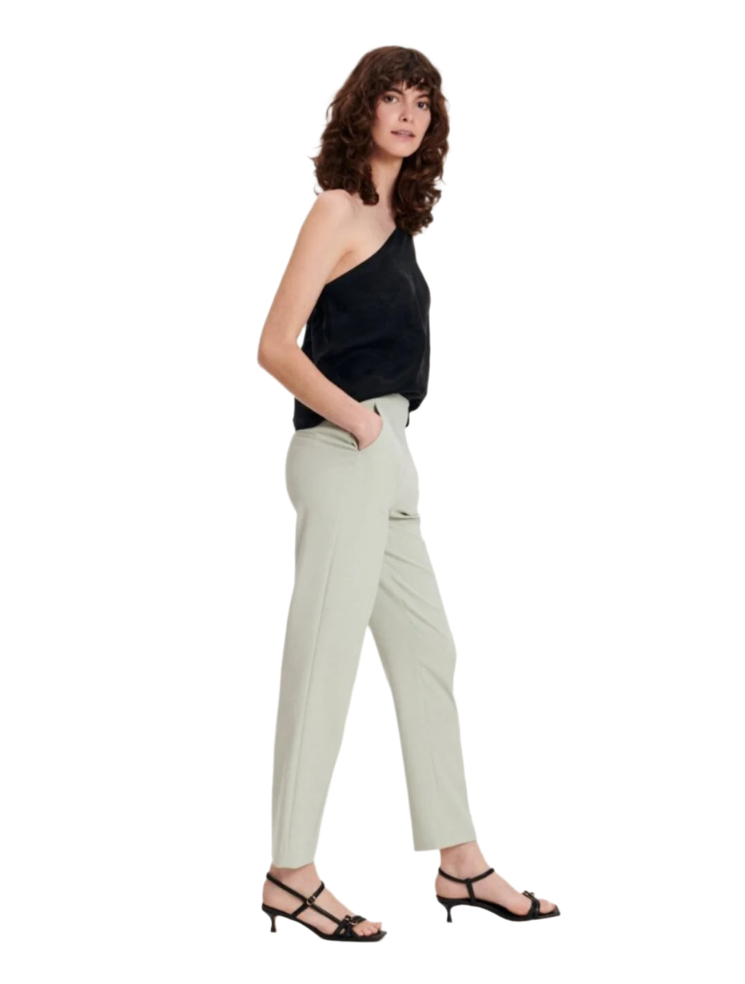 Címke nélküli, női elegáns nadrág, világos zöld színű, magas derekú, szűkített szárú fazon, varrott élvonallal, rugalmas anyagból, kényelmes és stílusos viselet irodai vagy alkalmi megjelenéshez.