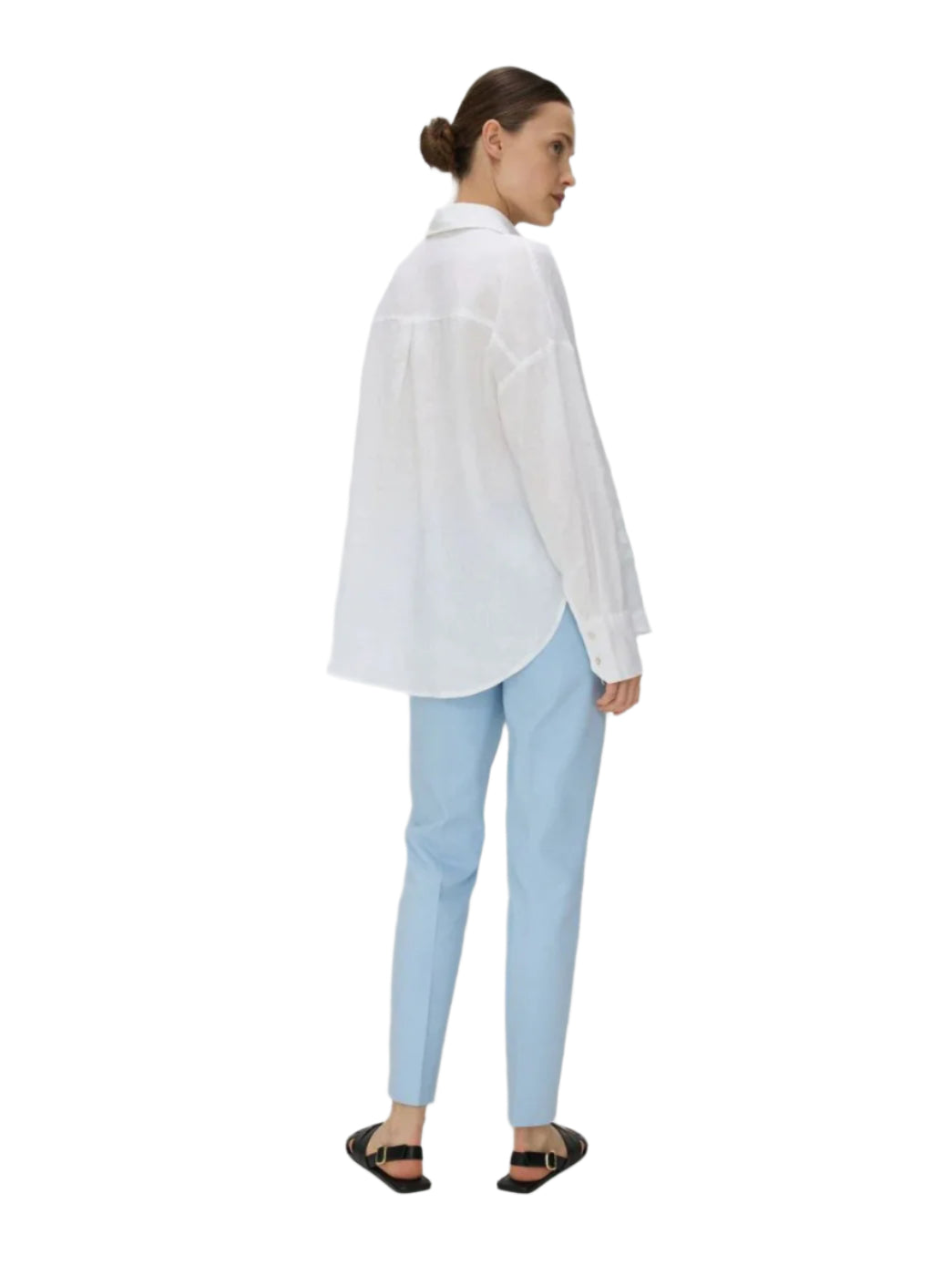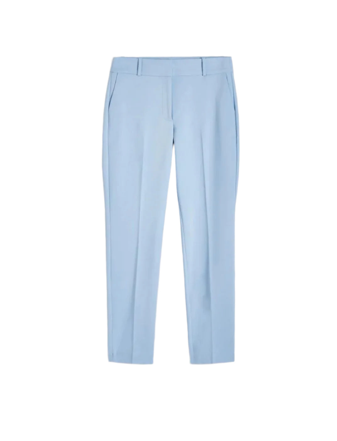 Címke nélküli, világoskék színű nadrág, elegáns, egyenes szárú szabással. Magas derekú kialakítás, oldalzsebekkel és övbújtatókkal. Tökéletes üzleti vagy alkalmi viseletként, könnyed és kifinomult megjelenést biztosít.