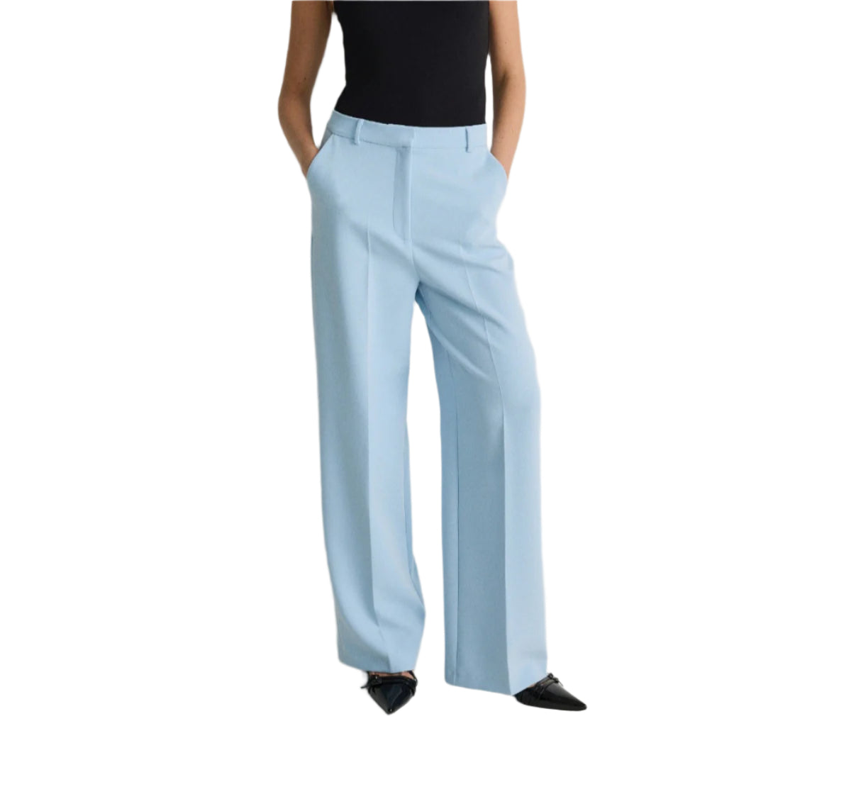 Címke nélküli, világoskék színű, elegáns nadrág. Magas derekú, egyenes szárú fazon, amely kifinomult megjelenést biztosít. Anyaga könnyed és kényelmes viseletet nyújt. Övbújtatós derékrésszel és cipzáras-záródású kialakítással rendelkezik. Ideális alkalmi és üzleti öltözethez.