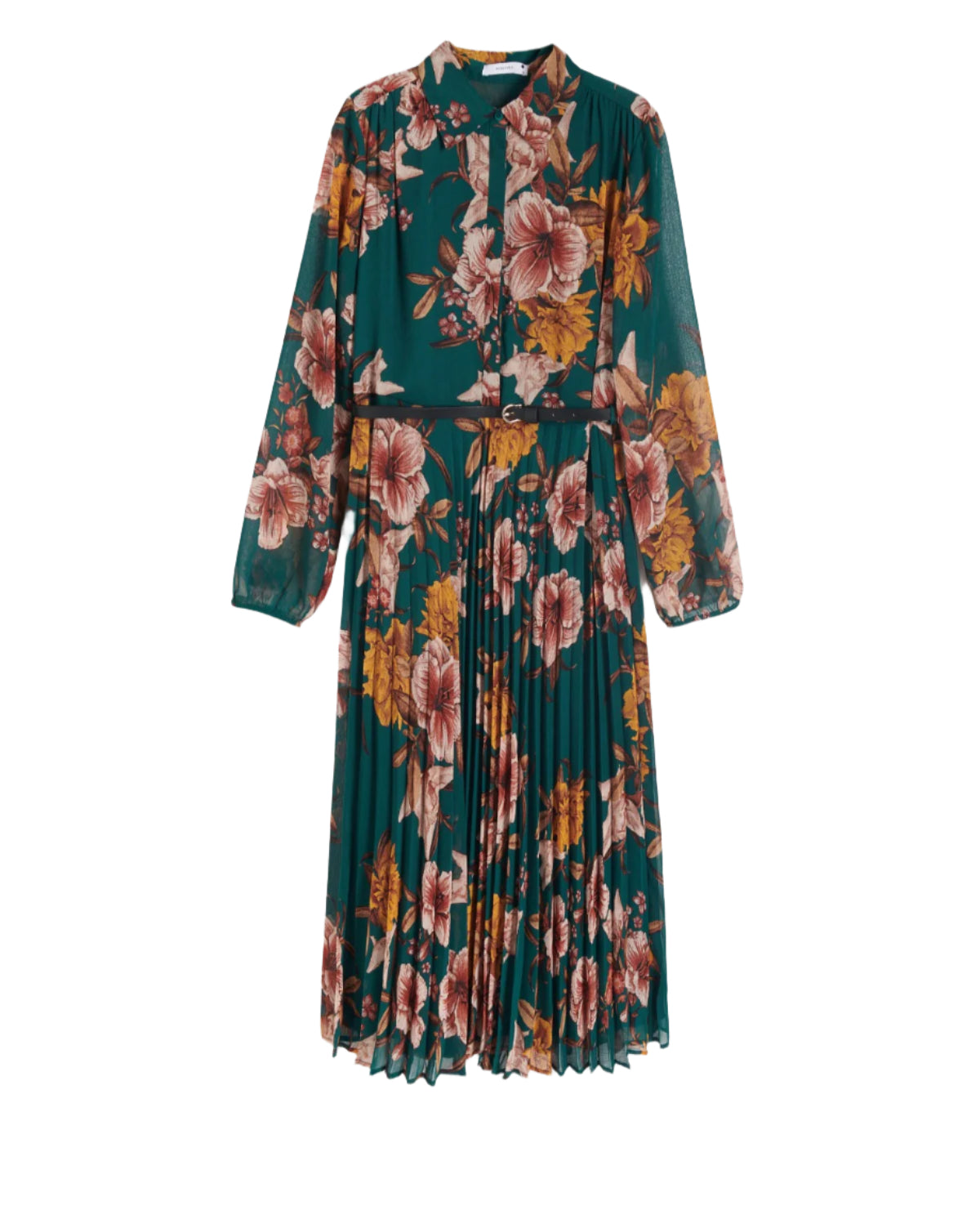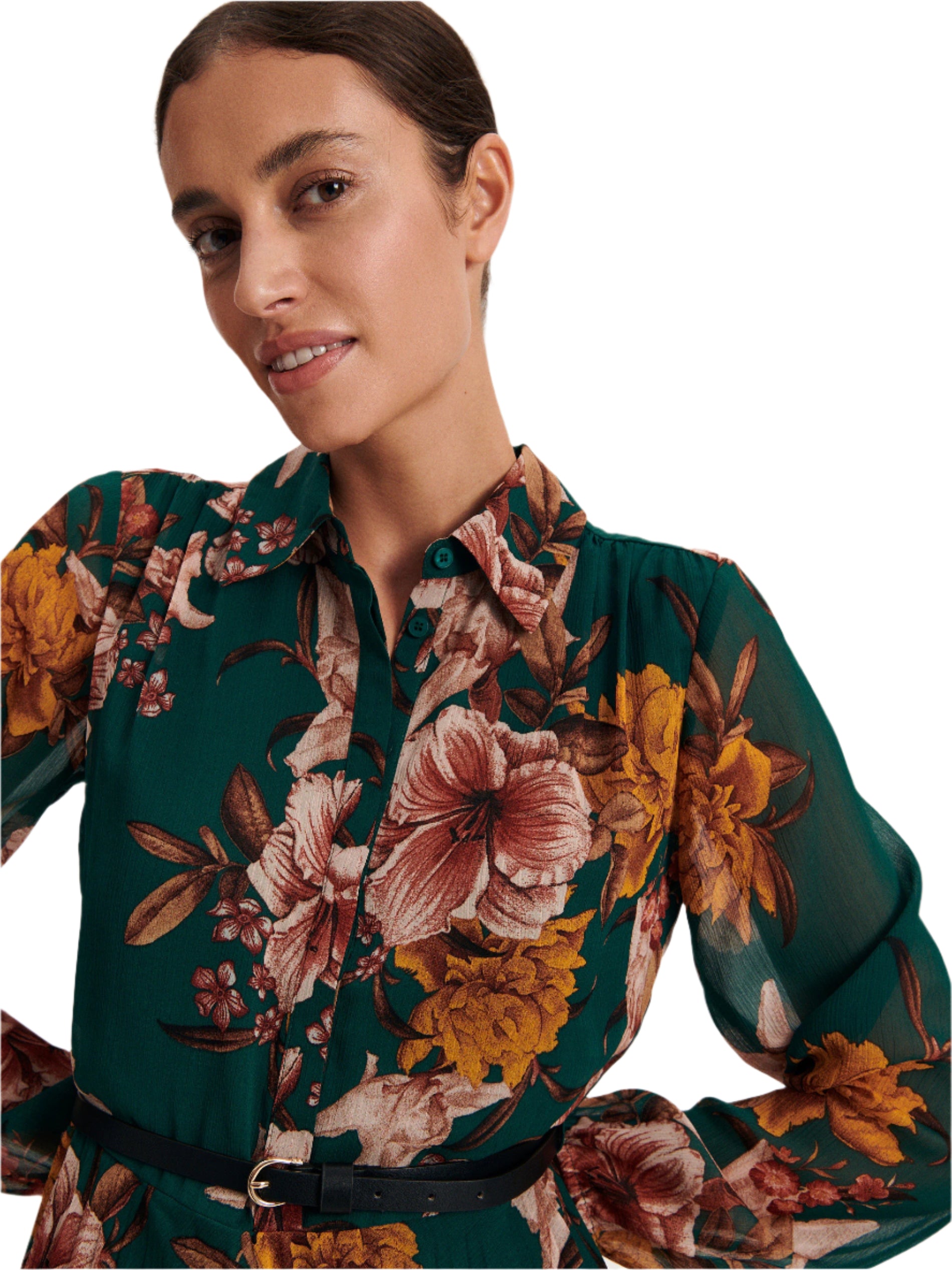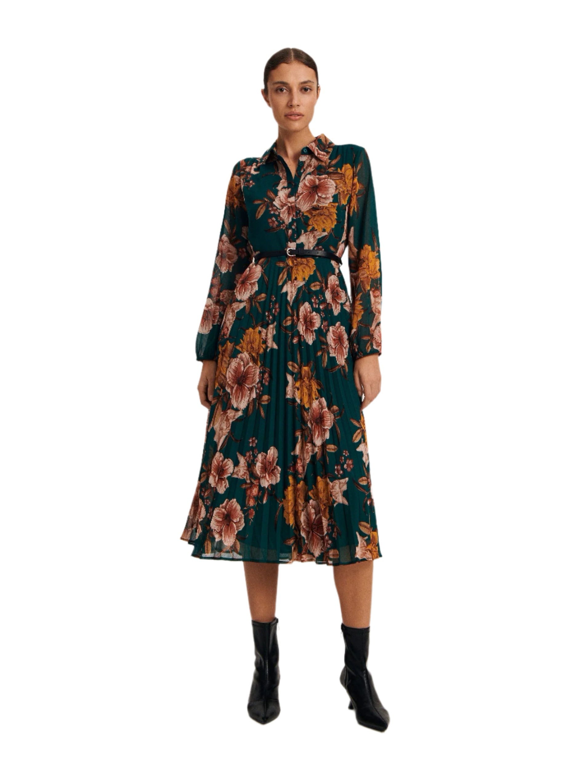 Címke nélküli, női midi ruha, zöld alapon barna és sárga virágmintával, hosszú ujjú, gombos ingfelsőrésszel, derékhangsúlyos szabással, pliszírozott szoknyarésszel, légies és elegáns viselet hétköznapokra vagy különleges alkalmakra.