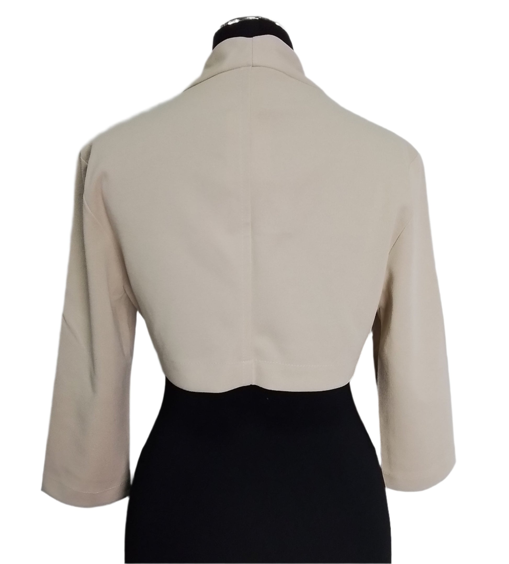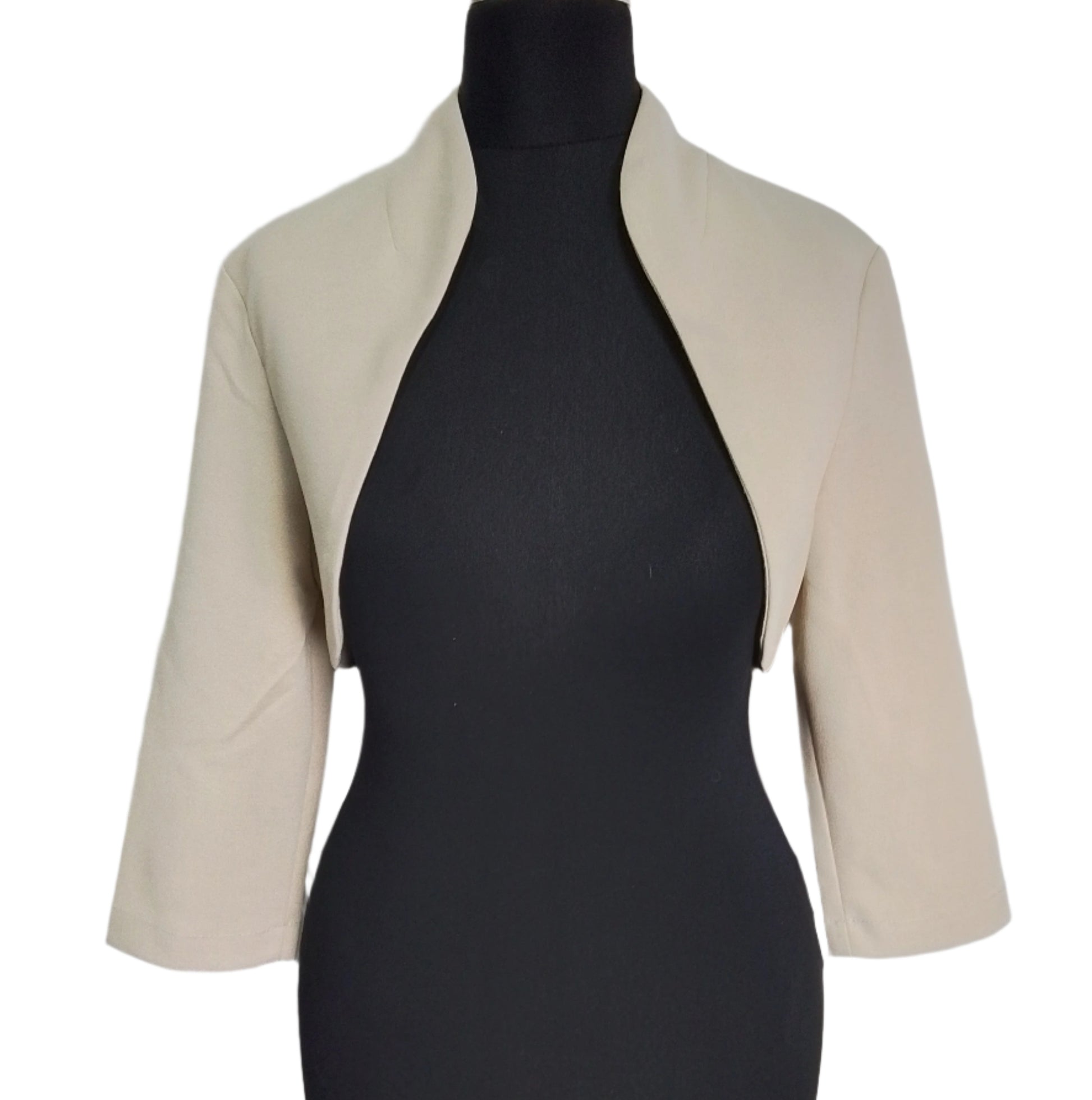 Címke nélküli, női rövid blézer, klasszikus bézs színben, gallér nélküli, ívelt elülső szabással, háromnegyedes ujjhossz, letisztult és elegáns kialakítás, tökéletes alkalmi vagy irodai viselethez.