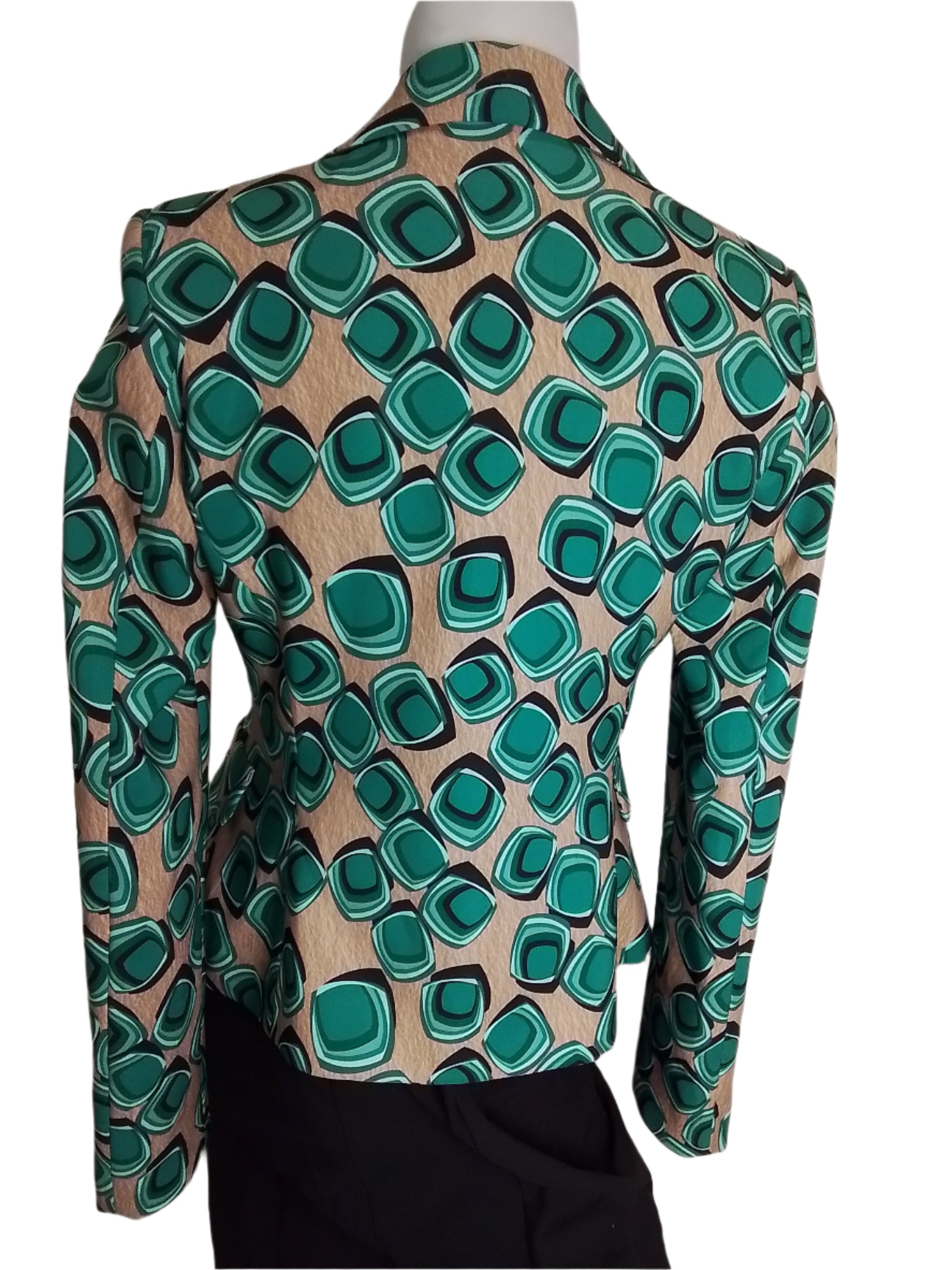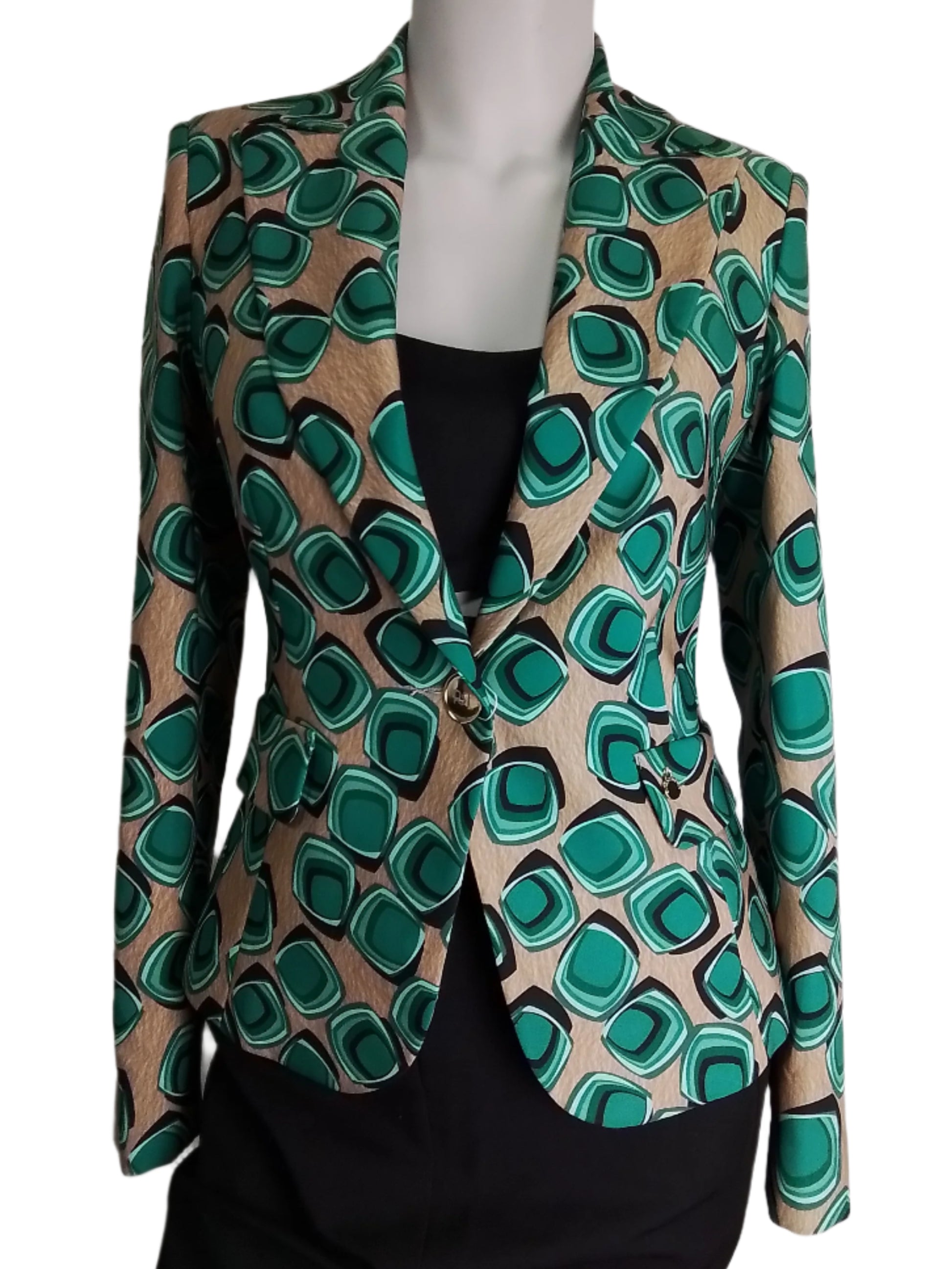 Címke nélküli, elegáns blézer élénk zöld és bézs geometrikus mintával. Klasszikus galléros kialakítással és gombos záródással rendelkezik, karcsúsított fazonja kiemeli az alakot. Tökéletes választás különleges alkalmakra vagy egyedi megjelenéshez.