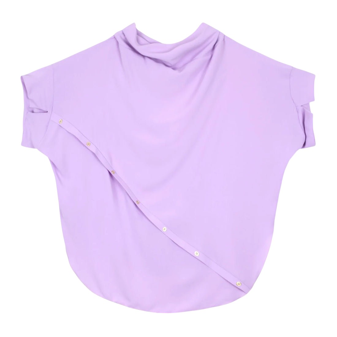 Címke nélküli, levendula, puha, esésű szövet (jersey?), laza fazon, csuklyás nyak (cowl neck), rövid, denevérujjszerű ujjak vállkivágással, lekerekített alj.