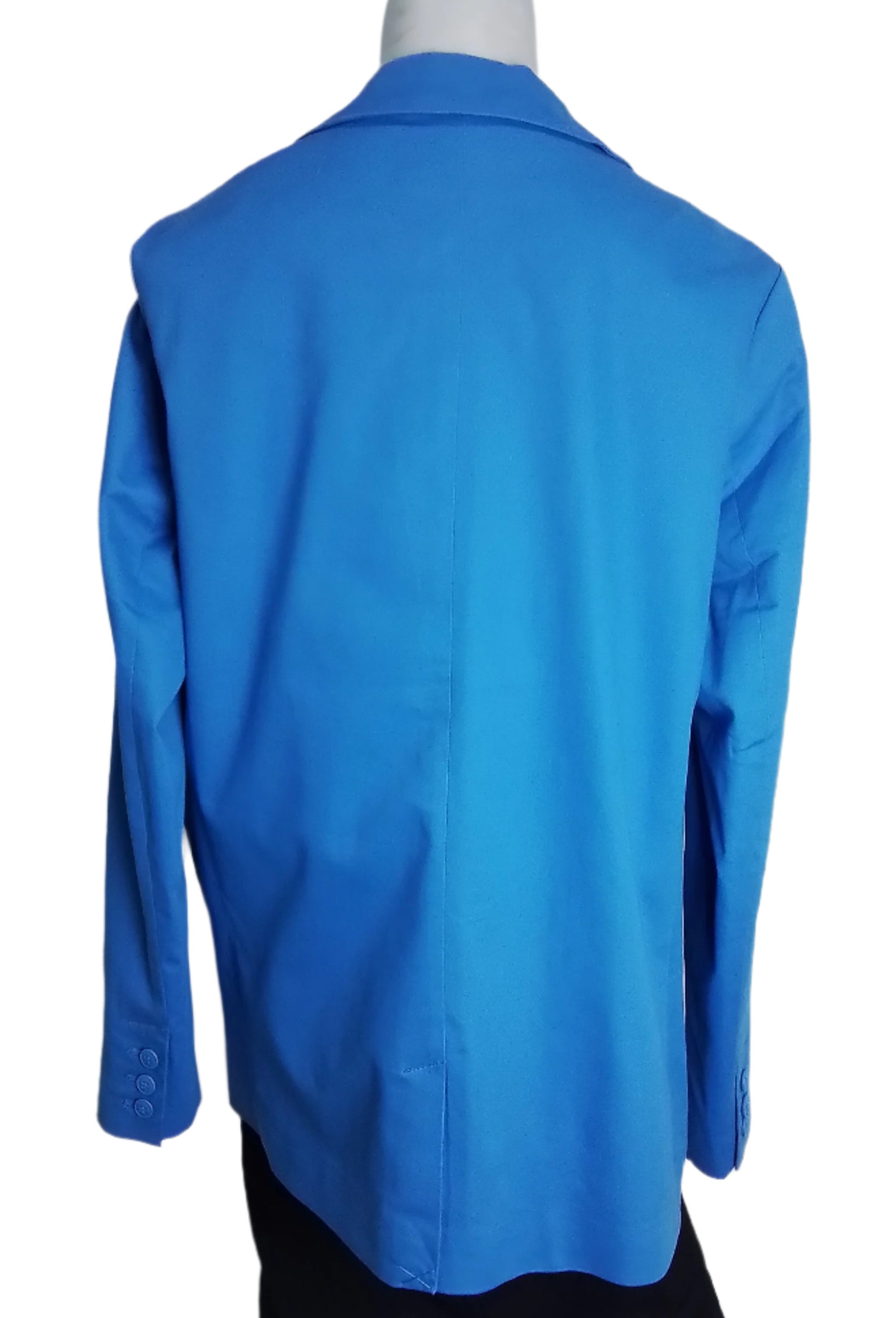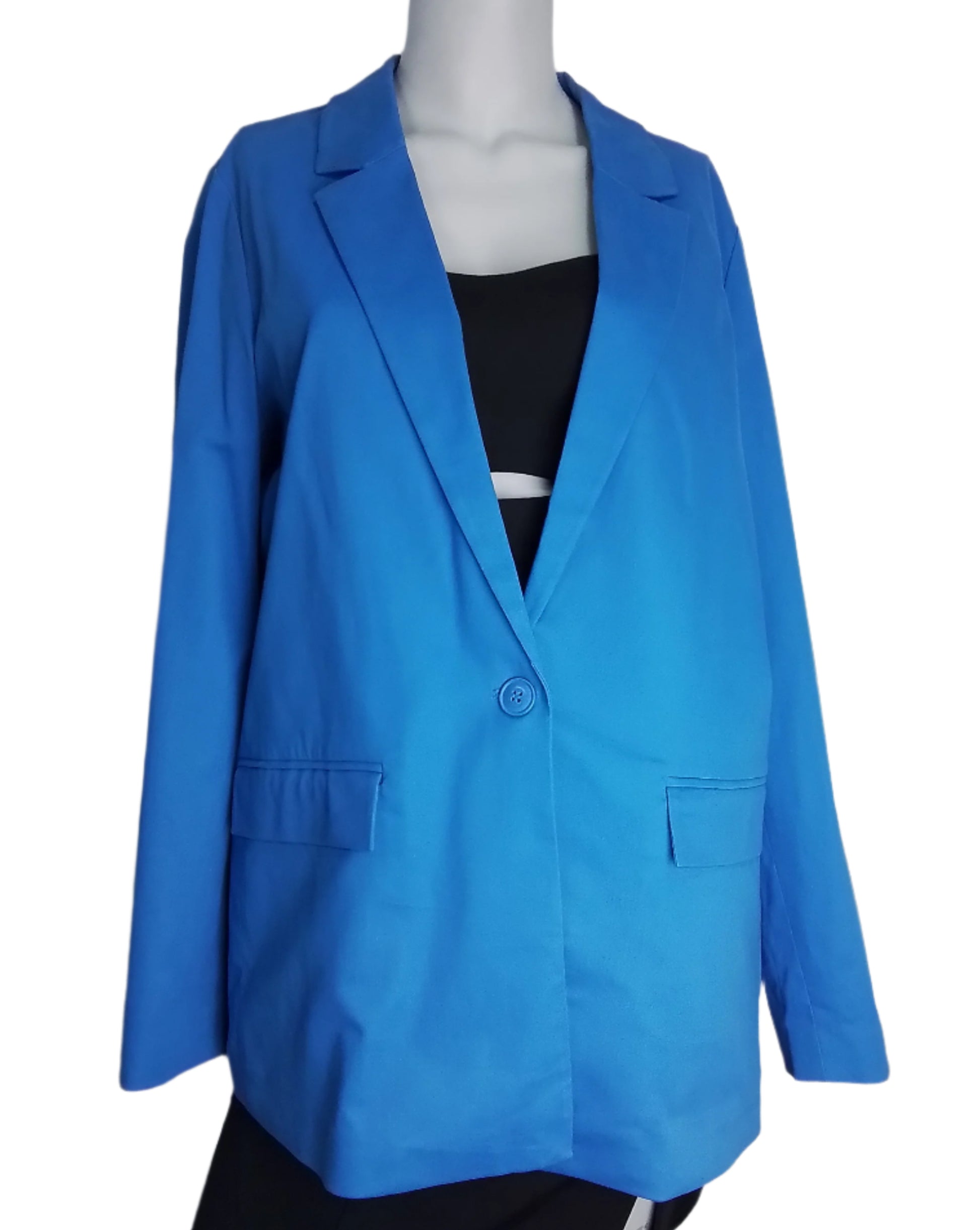 Címke nélküli, élénk kék blézer, egygombos záródással, galléros kialakítással, hosszú ujjal, két elülső zsebbel, elegáns és modern fazon, ideális irodai viselethez vagy alkalmi öltözékhez.
