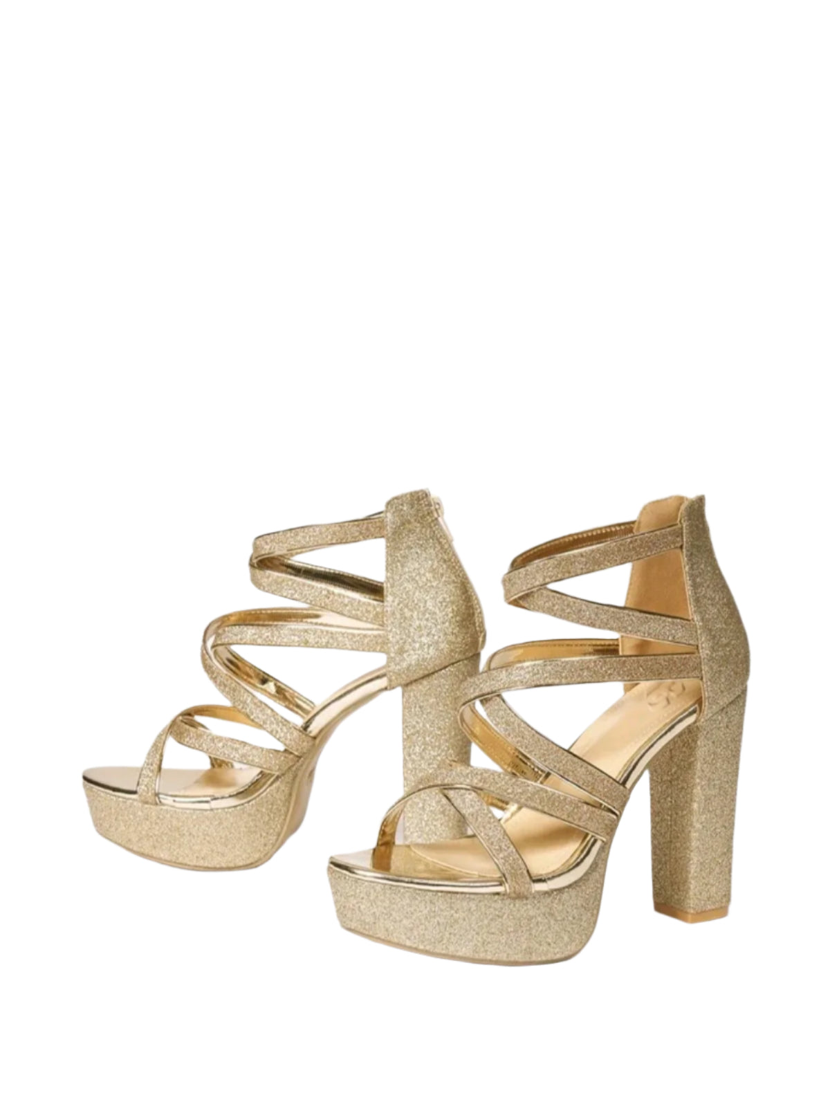 Címke nélküli, fényes arany színű, csillámos platform szandál vastag sarokkal és keresztpántos kialakítással. Extra stabilitást ad a hátsó zárt sarokrész és a cipzáras rögzítés. Elegáns választás alkalmi eseményekre, estélyekre vagy bulikra. Kényelmes, mégis magas sarkú fazon, mely kiemeli a láb vonalát.