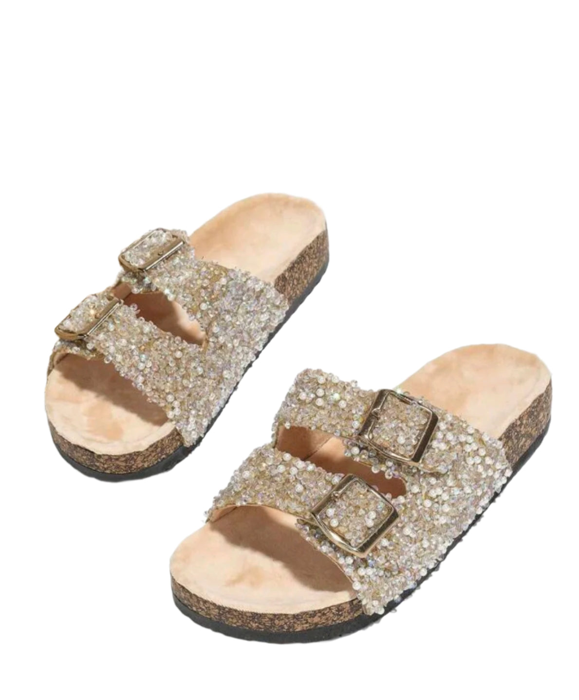Címke nélküli, csillogó strasszkövekkel díszített kényelmi papucs állítható arany csattal. Puha, bélelt talpbetéttel és parafa hatású talprésszel rendelkezik, amely extra kényelmet biztosít. Elegáns és kényelmes viselet nyári napokra, akár hétköznapi, akár alkalmi outfitekhez.