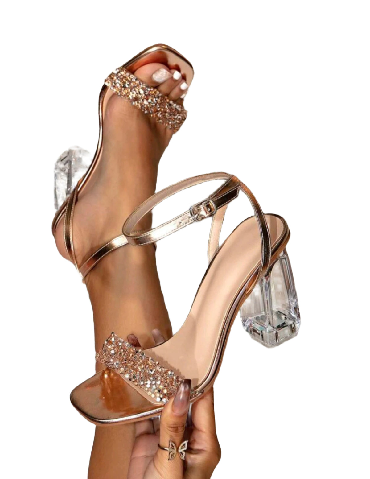 Címke nélküli, elegáns aranyszínű szandál csillogó strasszos pánttal és különleges átlátszó blokk sarokkal. Állítható bokapánttal rendelkezik, modern és kifinomult megjelenést biztosít különleges alkalmakra.
