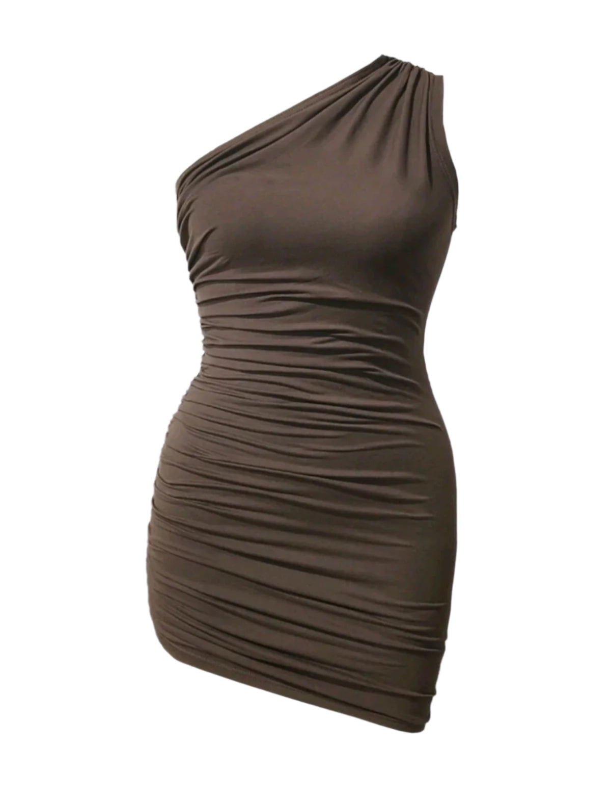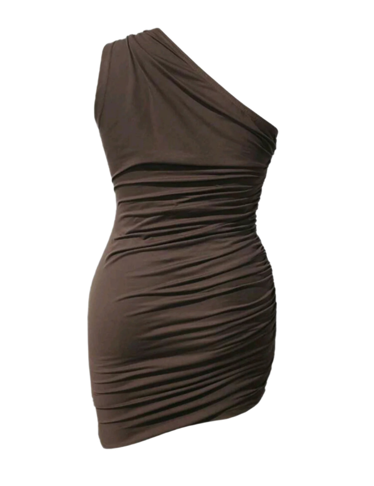 Címke nélküli, barna testhezálló miniruha rugalmas, redőzött anyaggal. Egyvállas kialakítása modern és elegáns megjelenést kölcsönöz. Lágy esésű, kényelmes viselet, amely tökéletes választás alkalmi és esti eseményekre.