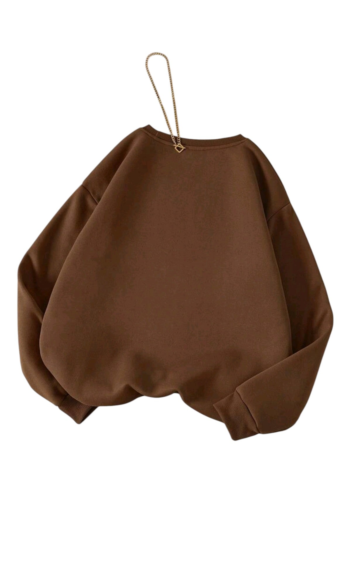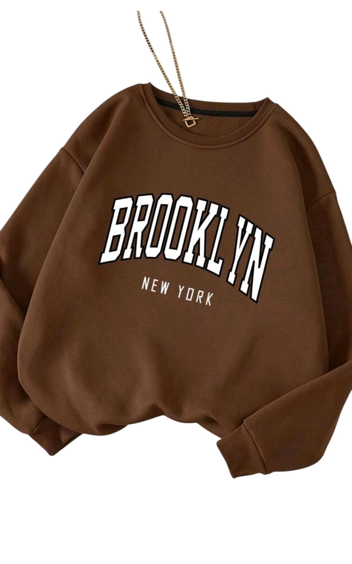 Címke nélküli, barna, pamutkeverék, kerek nyakú pulóver, hosszú ujjú, feliratos.