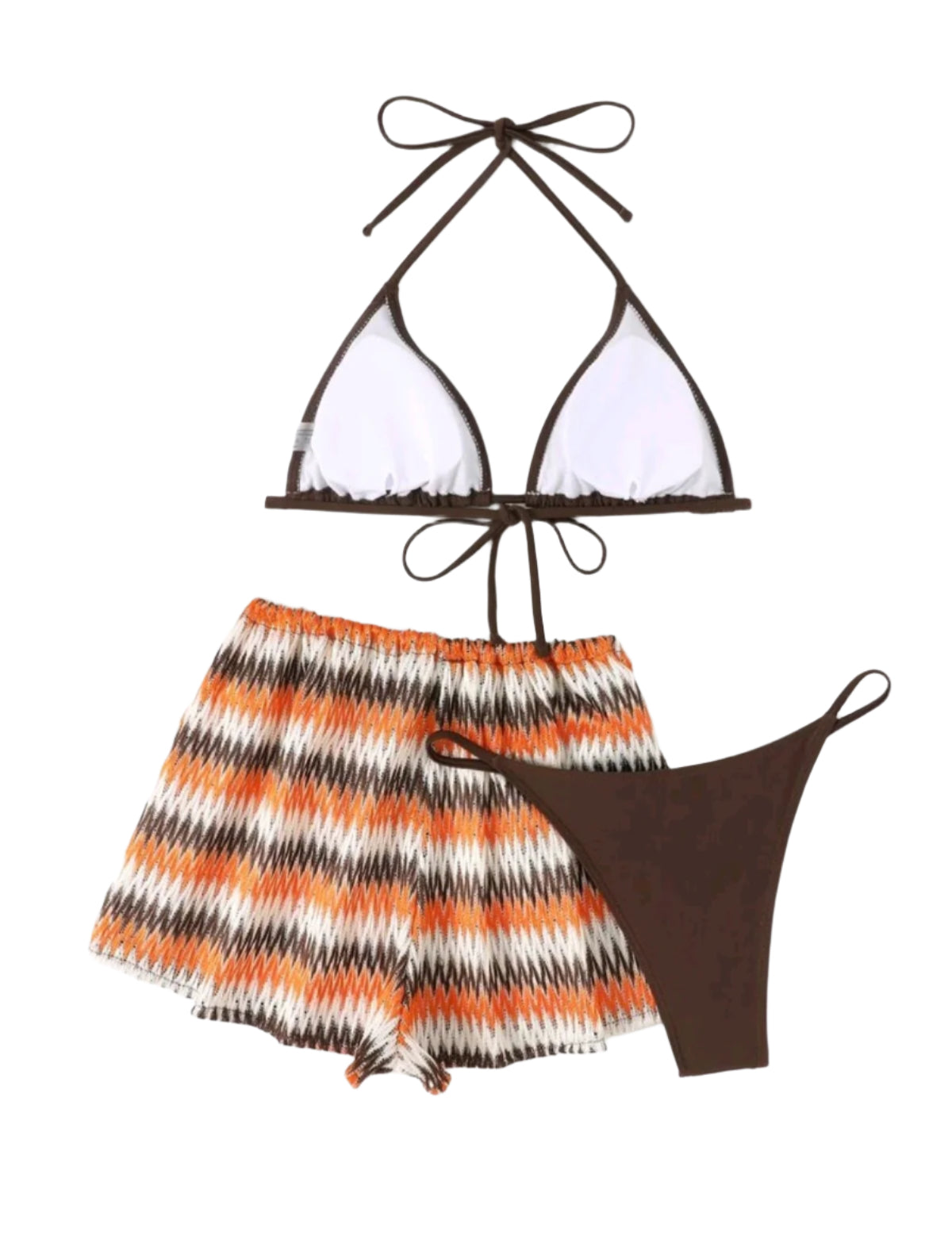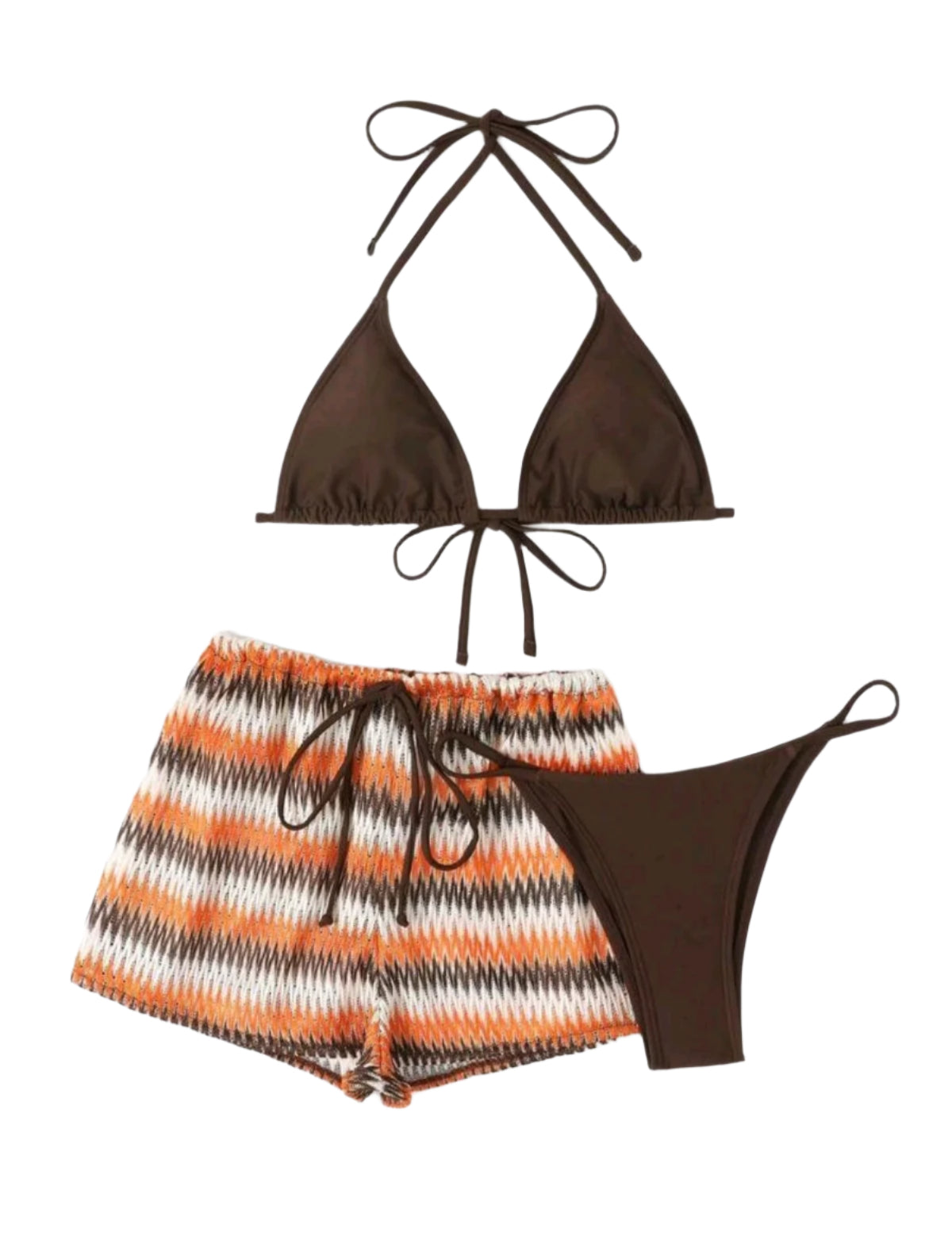 Címke nélküli, barna színű, háromszög fazonú bikini felső és alsó, hozzá illő narancs-barna-fehér mintás kötős rövidnadrággal, kényelmes és trendi strandviselet.