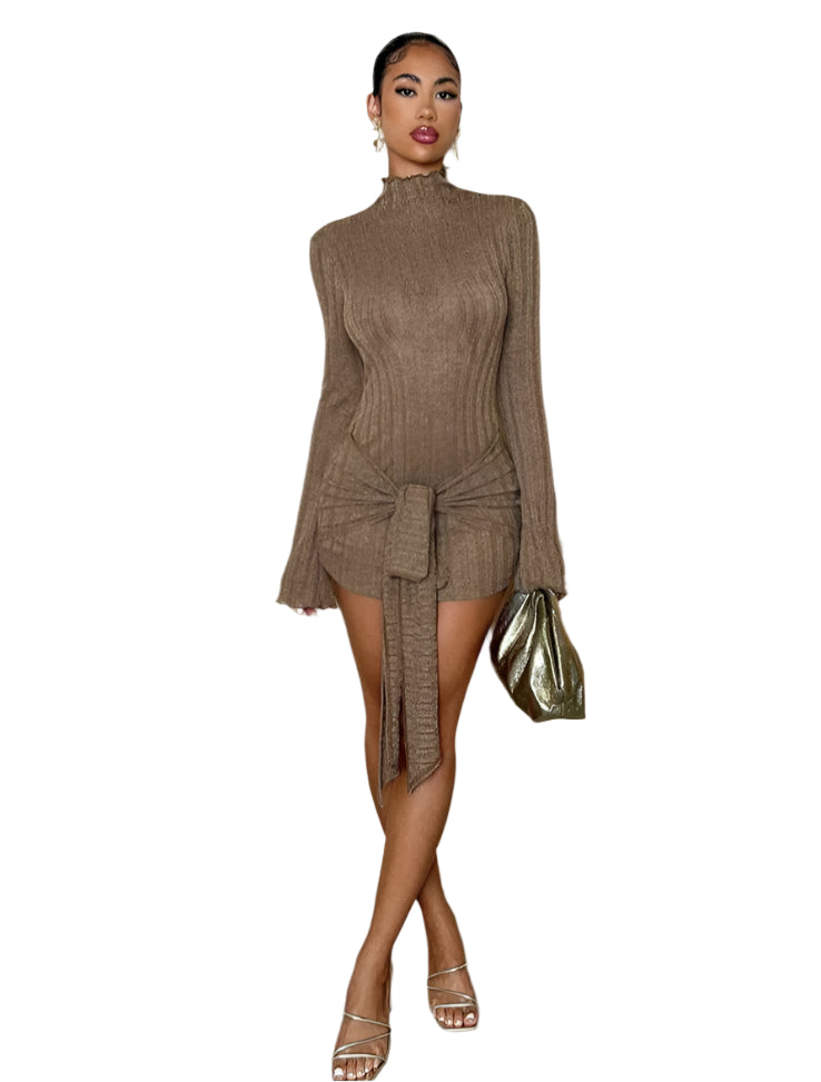 Címke nélküli, testhezálló barna kötött ruha magas nyakkal és hosszú ujjakkal. Elöl megkötős részlet teszi különlegessé, amely kiemeli a derekat. Elegáns és trendi választás esti programokra vagy különleges alkalmakra.