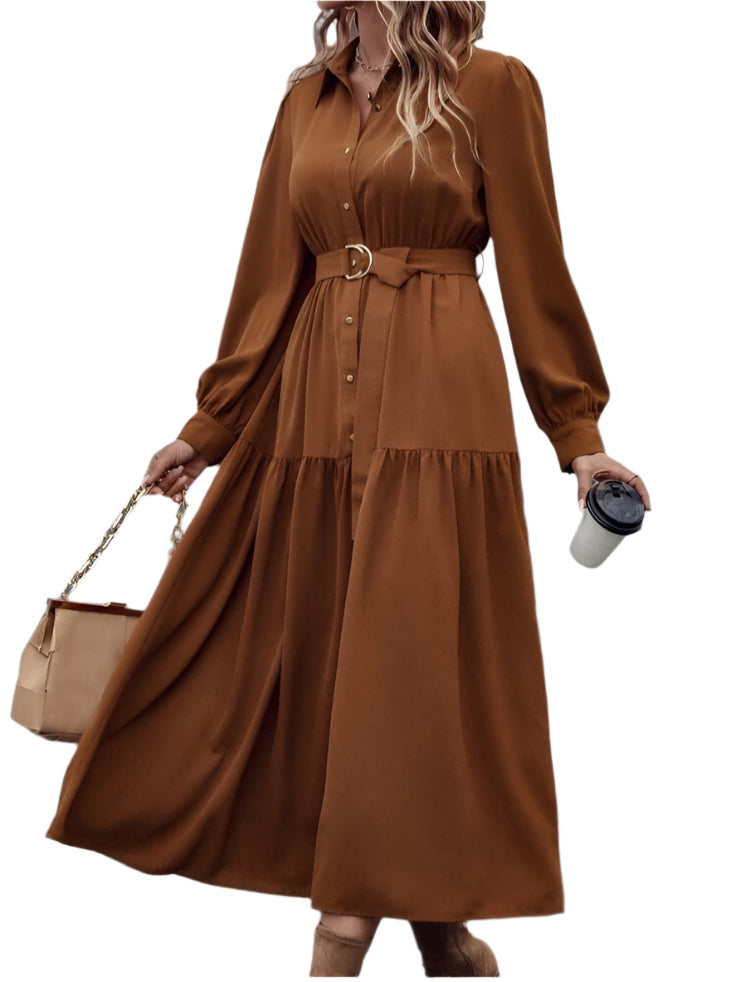 Címke nélküli, elegáns barna ingruha hosszú ujjakkal és gombos záródással. Derékrészen övvel kiemelhető a nőies sziluett. Légies anyaga és bő szoknyarésze kényelmes viseletet biztosít. Tökéletes választás őszi és tavaszi elegáns megjelenéshez.