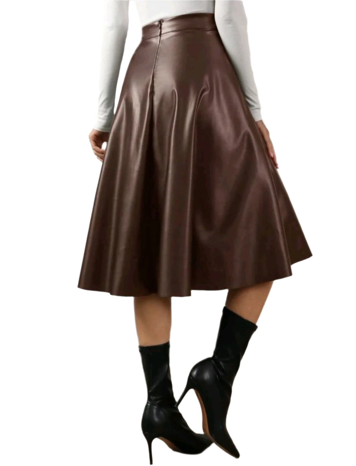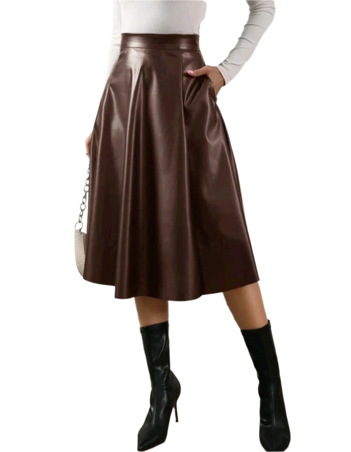 Címke nélküli, barna, magas derekú midi műbőrszoknya. Letisztult, elegáns szabásvonallal és enyhén bővülő fazonnal rendelkezik. Műbőr anyagának köszönhetően trendi és könnyen kombinálható mind hétköznapi, mind alkalmi viseletként.