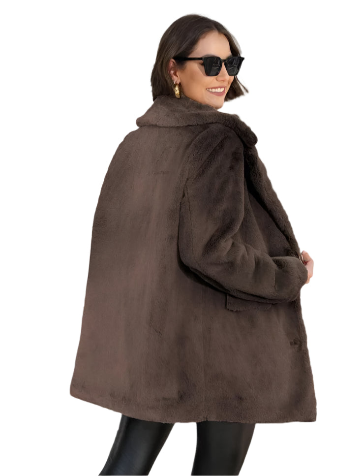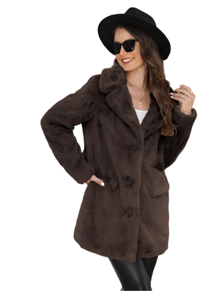 Címke nélküli, elegáns és puha tapintású plüss hatású kabát, amely tökéletes választás a hideg időszakokra. A klasszikus szabás és a gombos záródás stílusossá és kényelmessé teszi. Letisztult barna árnyalata könnyen kombinálható különböző szettekkel.