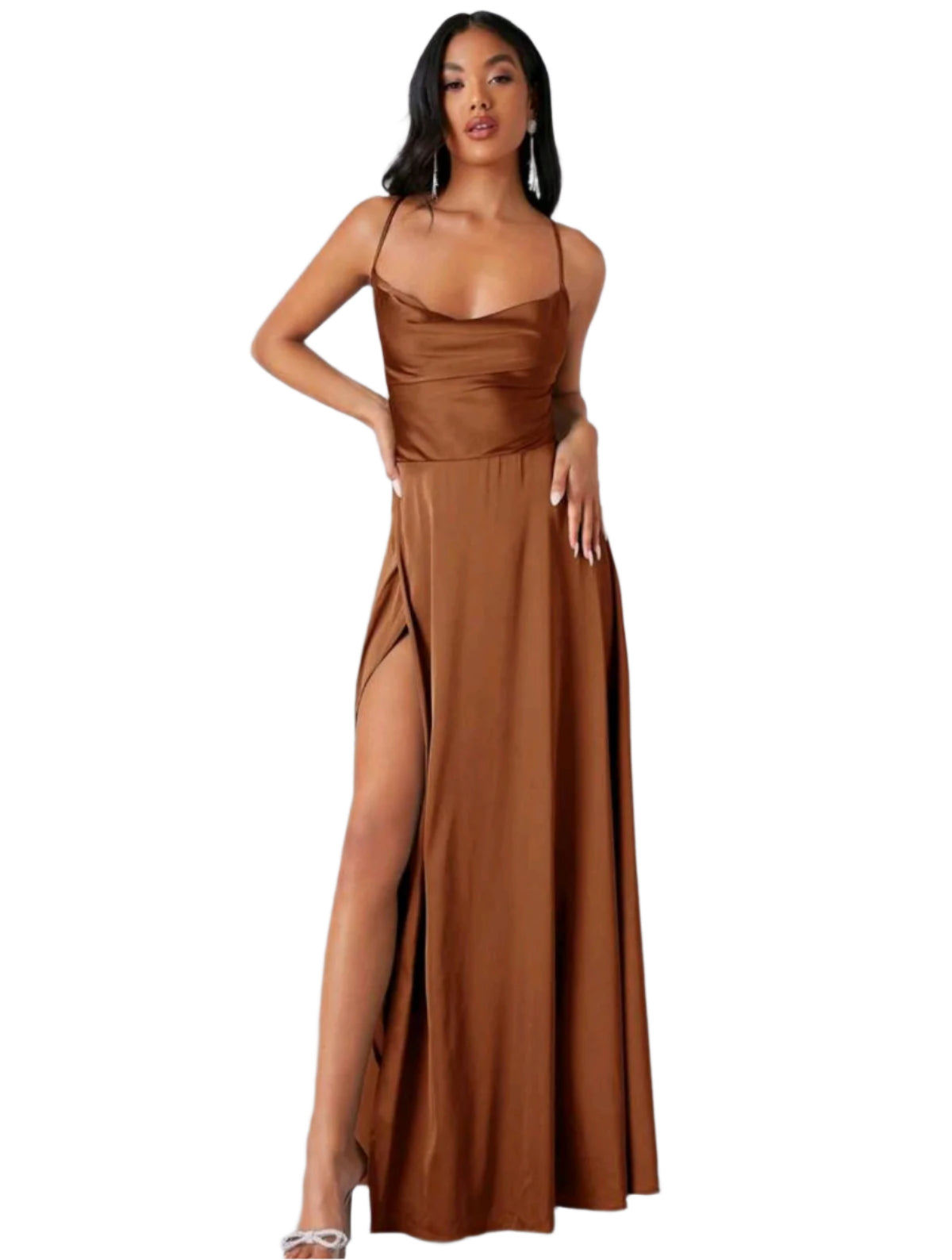 Címke nélküli, elegáns barna maxi ruha fényes, selyemhatású anyagból. Lágy esésű sziluettje nőies megjelenést biztosít, míg a finoman ráncolt, ejtett nyakkivágás és a vékony spagettipántok kifinomult stílust kölcsönöznek. Magas oldalsliccelése kihangsúlyozza a lábakat, tökéletes választás alkalmi eseményekre, esti rendezvényekre vagy elegáns megjelenéshez.