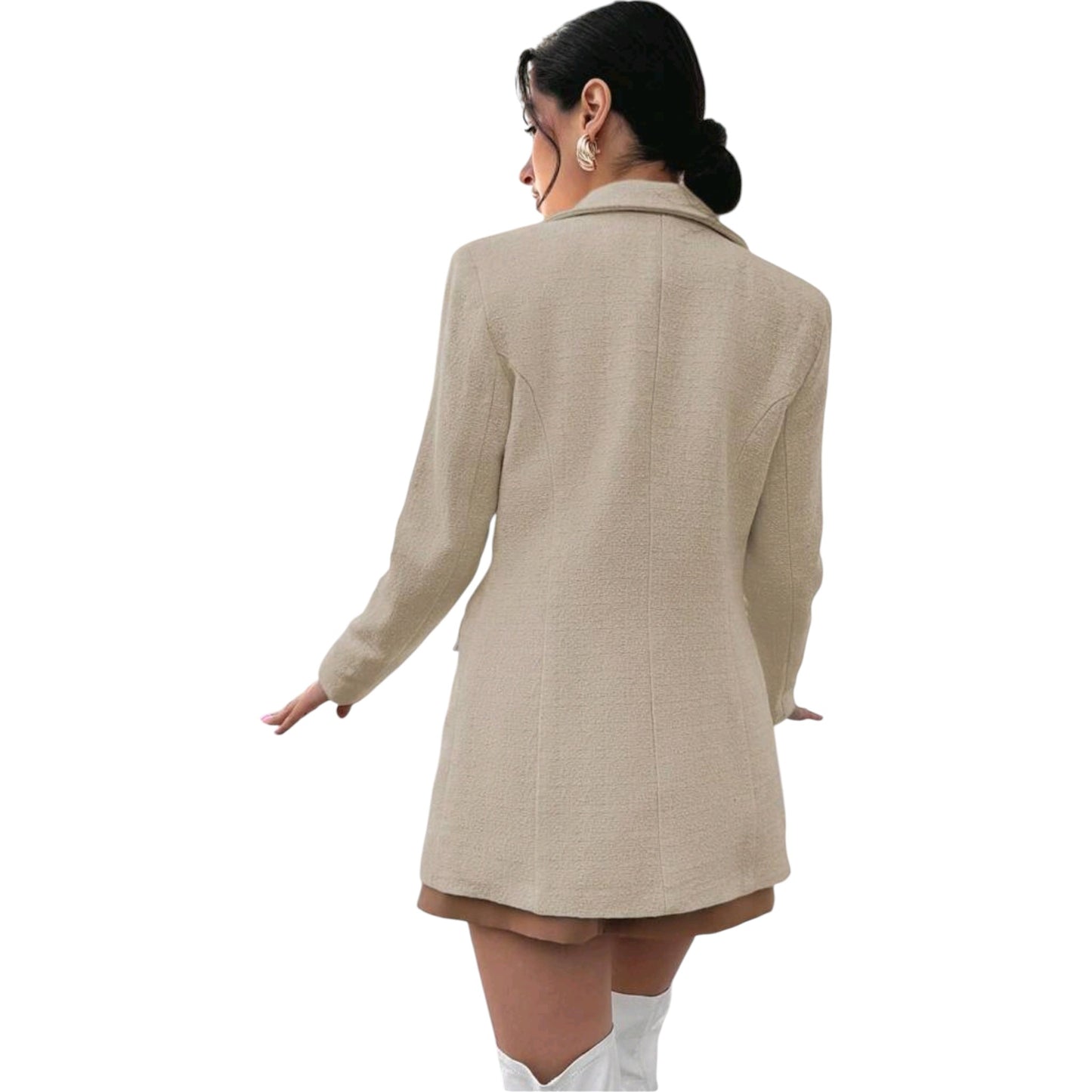 Címke nélküli, bézs, tweed hatású, dupla gombsoros blézerruha arany gombokkal és zsebekkel.