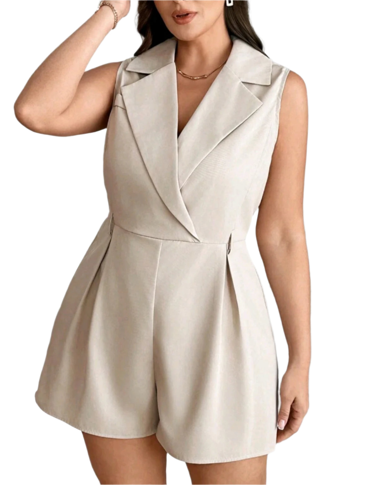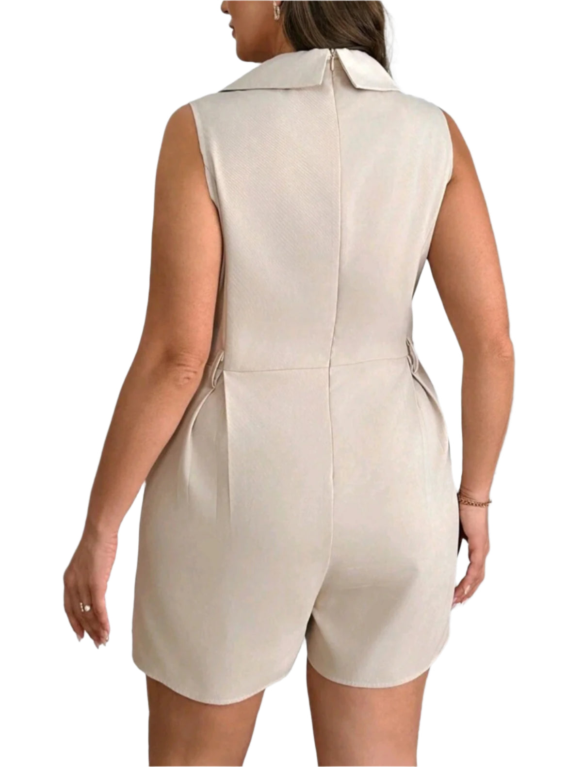 Címke nélküli, bézs színű, ujjatlan overál puha, strukturált anyagból. Klasszikus hajtókás gallérral és V-nyakkivágással rendelkezik, mely elegáns és letisztult megjelenést kölcsönöz. A derékrésznél enyhén szabott, lefelé bővülő rövid szárakkal, ami nőies sziluettet biztosít. Ideális választás irodai viselethez, nyári rendezvényekhez vagy egy elegáns vacsorához.