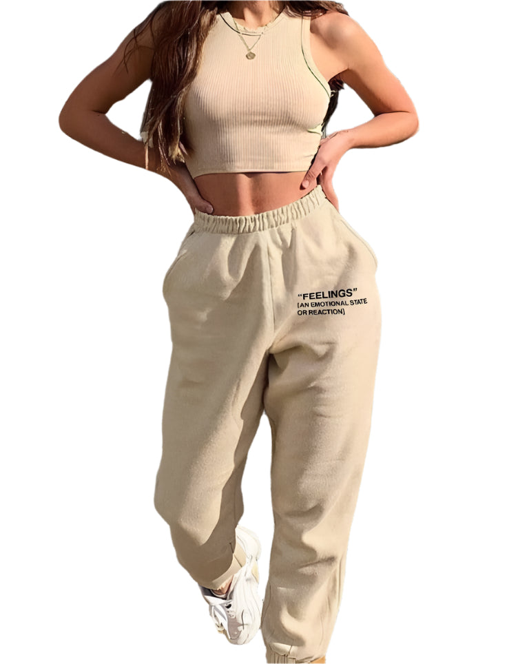 Címke nélküli, trendi és kényelmes melegítő szett, amely egy magas derekú, puha anyagú melegítőnadrágból és egy hozzáillő, bordázott crop topból áll. A nadrág gumis derékrésszel és szűkülő szárakkal rendelkezik a tökéletes illeszkedésért, míg a "Feelings" felirat sportos és modern megjelenést biztosít. Ideális laza hétköznapi viseletre vagy aktív napokra.