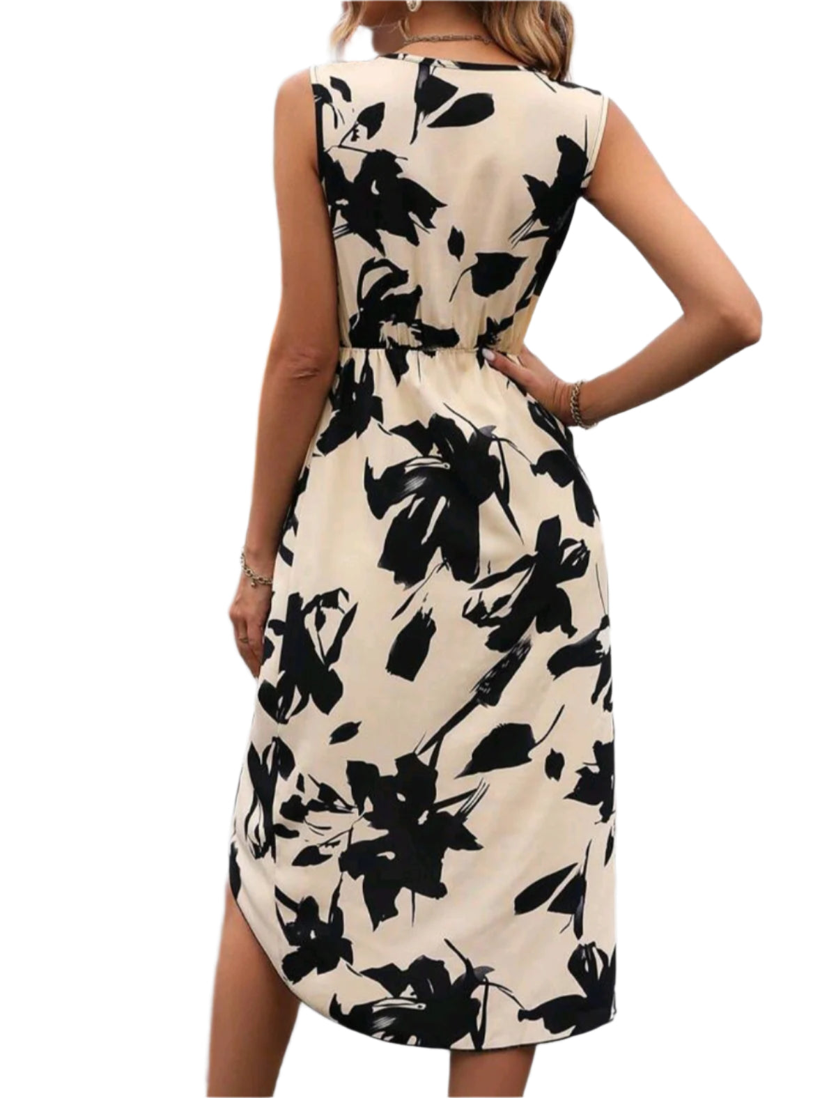 Címke nélküli, könnyű, bézs alapú ruha fekete virágmintával díszítve. Átlapolt felsőrész V-kivágással, ujjatlan fazon, derékban enyhén szűkített, térdig érő szabás. Kényelmes és elegáns választás munkába, városi sétákhoz vagy nyári programokra.