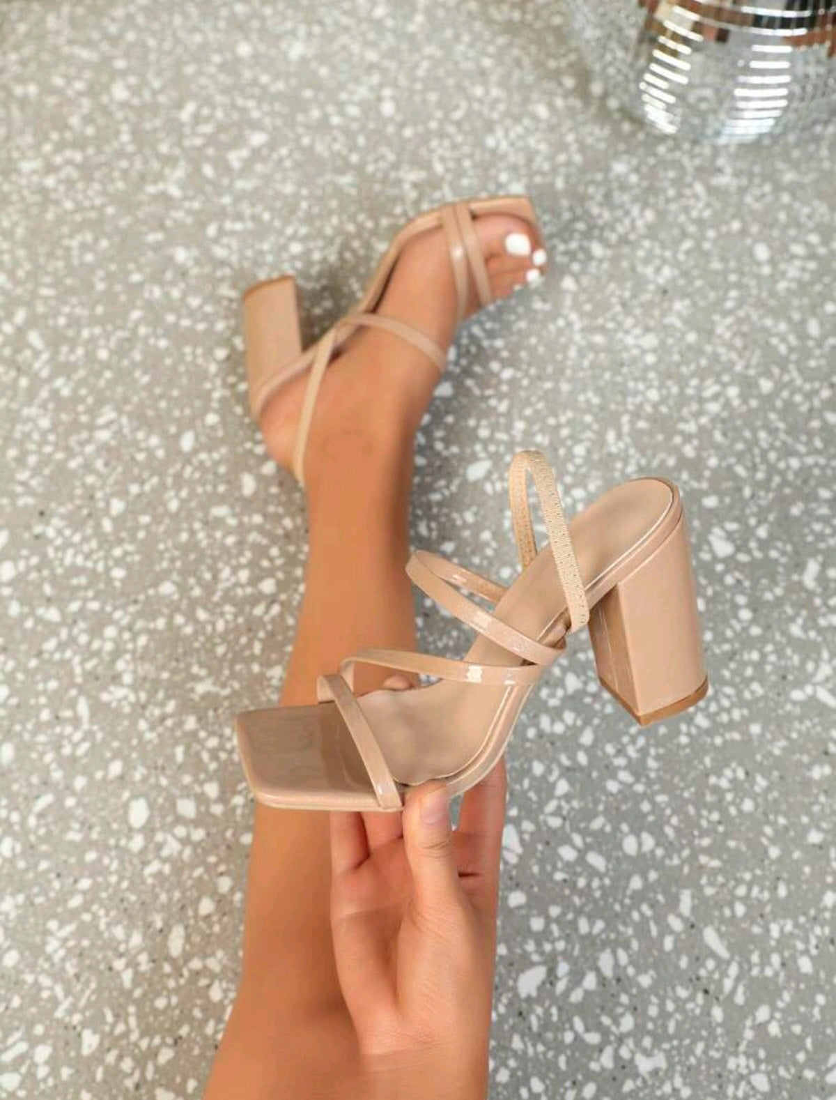 Címke nélküli, elegáns bézs színű, fényes anyagból készült szandál. Vékony, keresztezett pántokkal és négyzetes orr-résszel, magas, vastag sarokkal a stabilitás érdekében. Tökéletes választás alkalmi viselethez vagy nyári megjelenéshez.