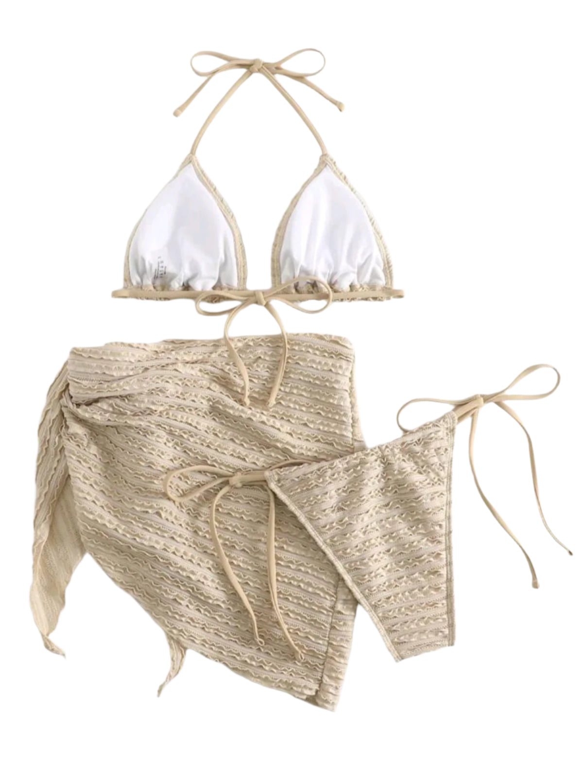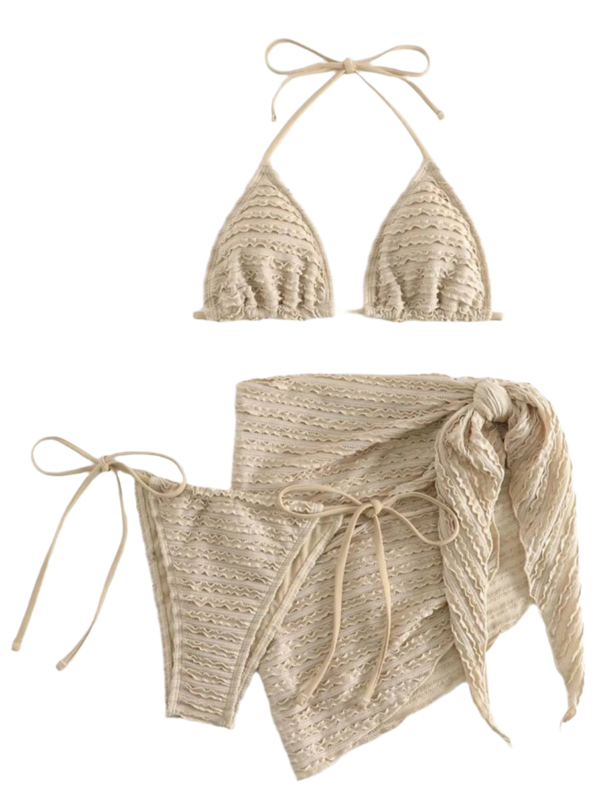 Címke nélküli, háromrészes bézs bikini szett fodros, horgolt hatású anyagból. A háromszög fazonú melltartó nyakba köthető, a bugyi oldalt megkötős, a hozzá tartozó pareo szoknya pedig tökéletes kiegészítő a strandon. Légies és divatos megjelenést biztosít nyaraláshoz vagy medencepartihoz.