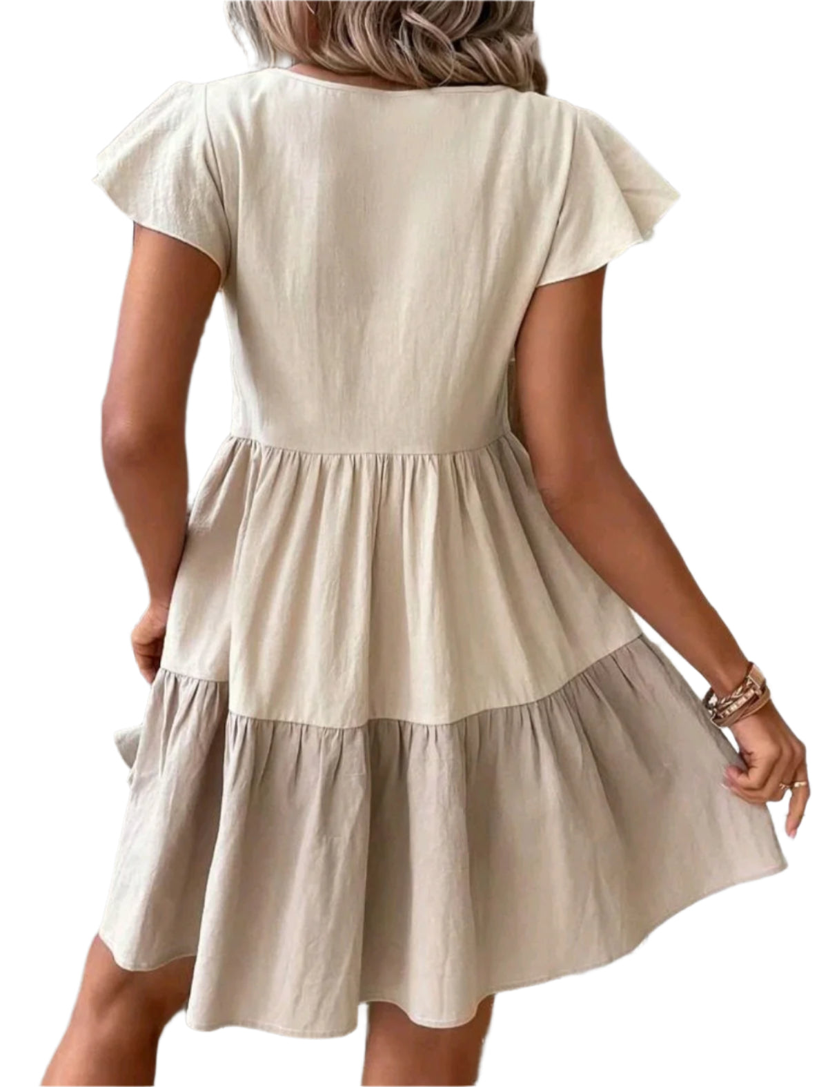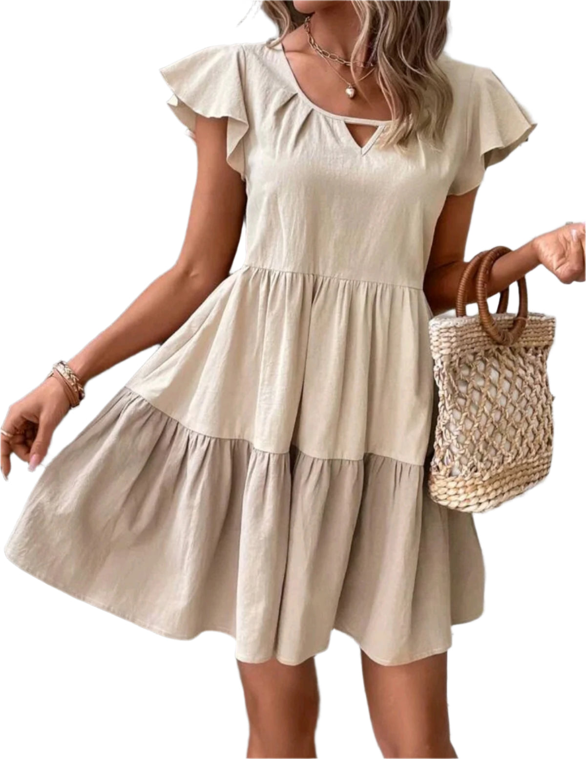 Címke nélküli, női ruha, nyári, bézs árnyalatú, rövid fodros ujjakkal, kerek nyakkivágással és diszkrét V-kivágásos díszítéssel, kétszintes fodros szoknyarésszel, laza, A-vonalú szabásban, könnyű, természetes hatású anyagból, ideális hétköznapi viseletre, nyaraláshoz vagy piknikhez.