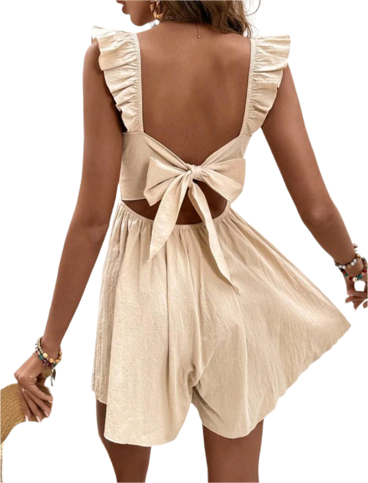 Címke nélküli, könnyed és légies anyagból készült bézs színű overál. Négyzet alakú nyakkivágásával és bájos fodros vállmegoldásával romantikus megjelenést biztosít. A derékhangsúlyos szabás kényelmes és nőies viseletté teszi. Tökéletes választás nyári napokra, laza, mégis stílusos megjelenéshez.