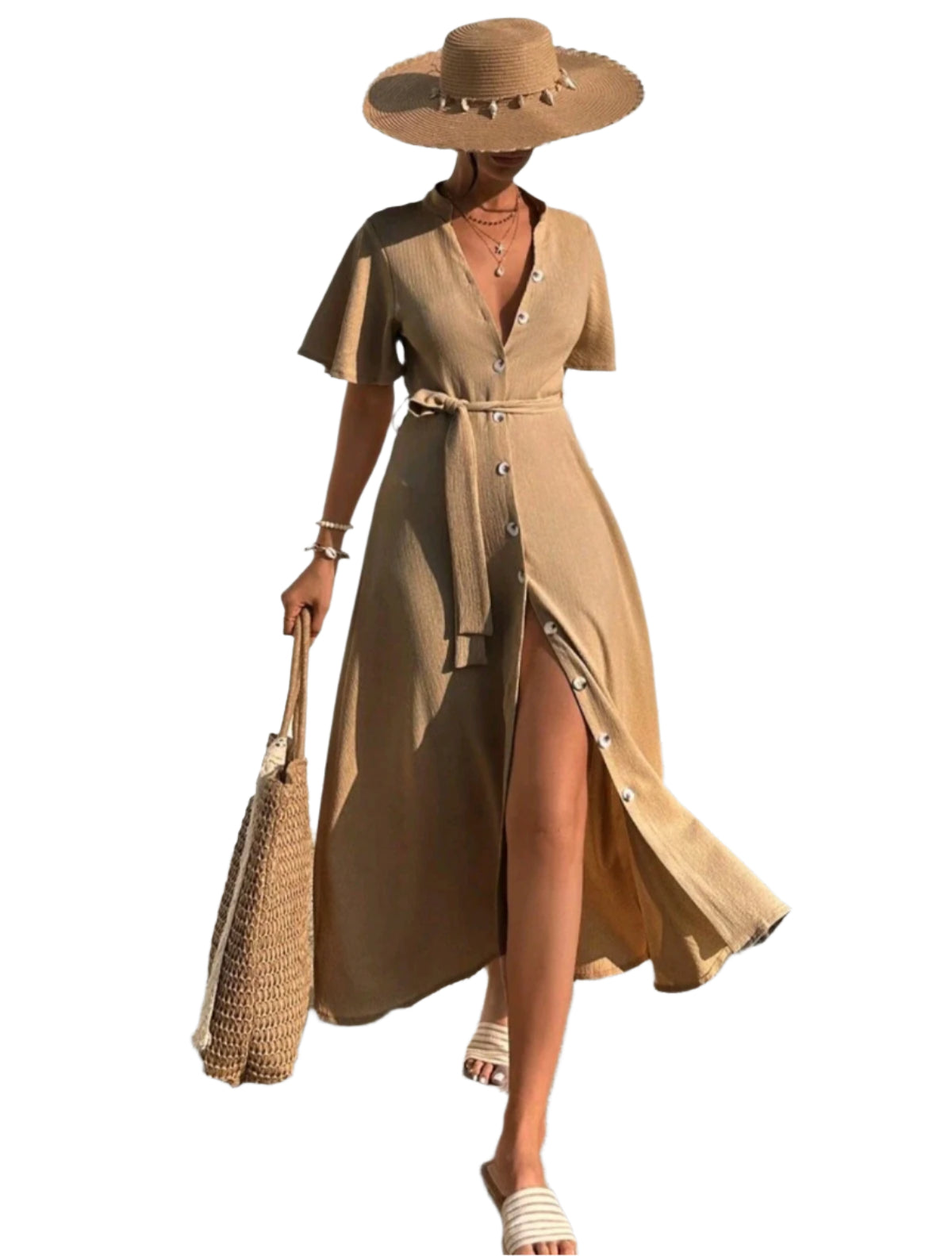 Címke nélküli, könnyű, légies anyagú bézs nyári ruha, V-nyakkivágással, rövid, bő ujjakkal, elöl végig gombolható kialakítással. Derékban megkötős, hasítékkal díszített, maxi hosszúságú fazon. Tökéletes választás a forró nyári napokra, tengerpartra vagy városi sétákhoz.