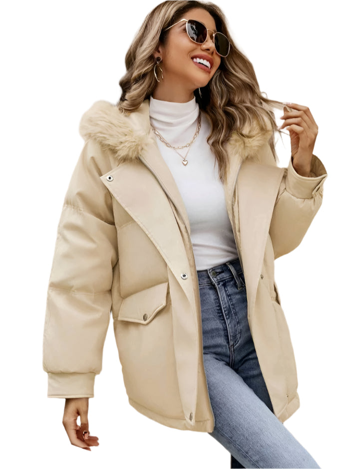 Címke nélküli, meleg és divatos téli kabát prémes kapucnival. Bézs színének és letisztult kialakításának köszönhetően könnyen kombinálható hétköznapi és elegáns szettekkel is. Kényelmes viselet a hideg napokra!