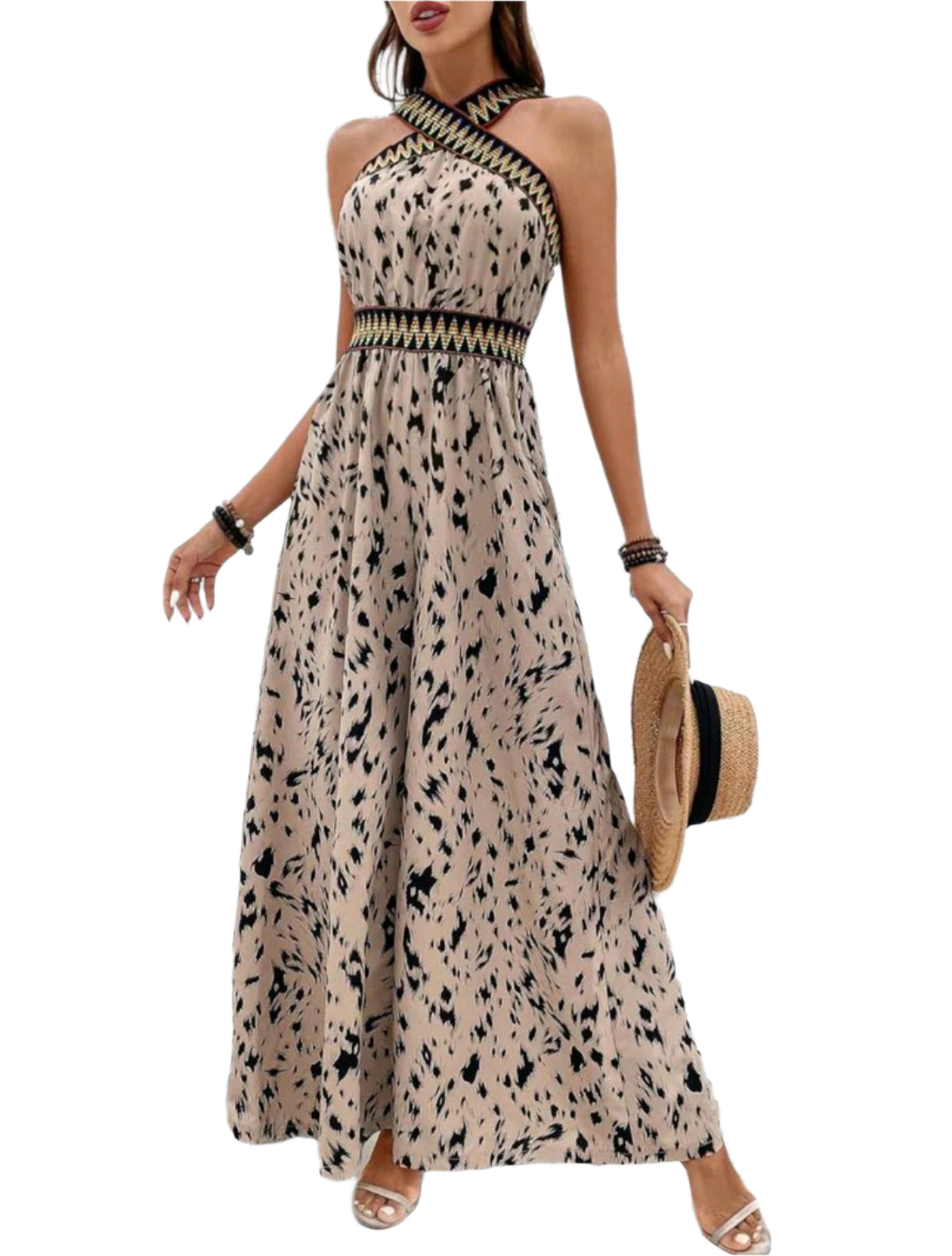 Címke nélküli, könnyed bézs maxi ruha fekete absztrakt mintával és etno ihletésű szegélyekkel. Keresztpántos nyakrész és szűkített derék hangsúlyozza az alakot, míg az áramló szabás légies mozgást biztosít. Kiváló választás nyári eseményekre, tengerparti sétákhoz vagy bohém stílusú alkalmakra.