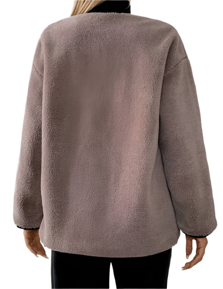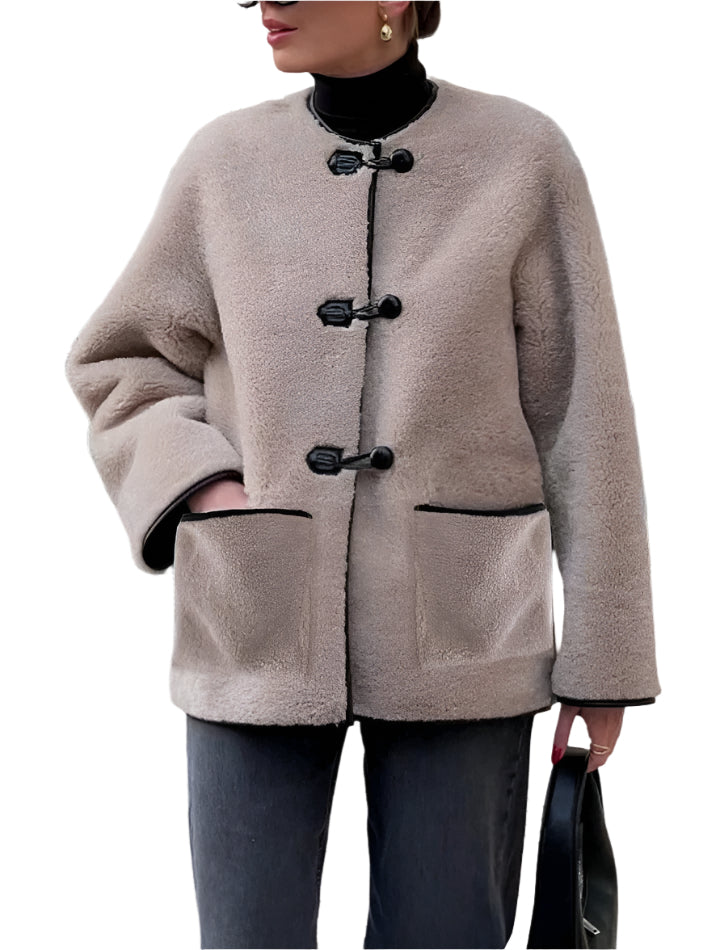 Címke nélküli, kifinomult és egyedi kabát puha, meleg anyagból. Elegáns fekete részletekkel és különleges kapcsos záródással rendelkezik. Kényelmes, mégis stílusos választás a hűvösebb napokra, amely könnyedén kombinálható hétköznapi és elegáns szettekkel is.