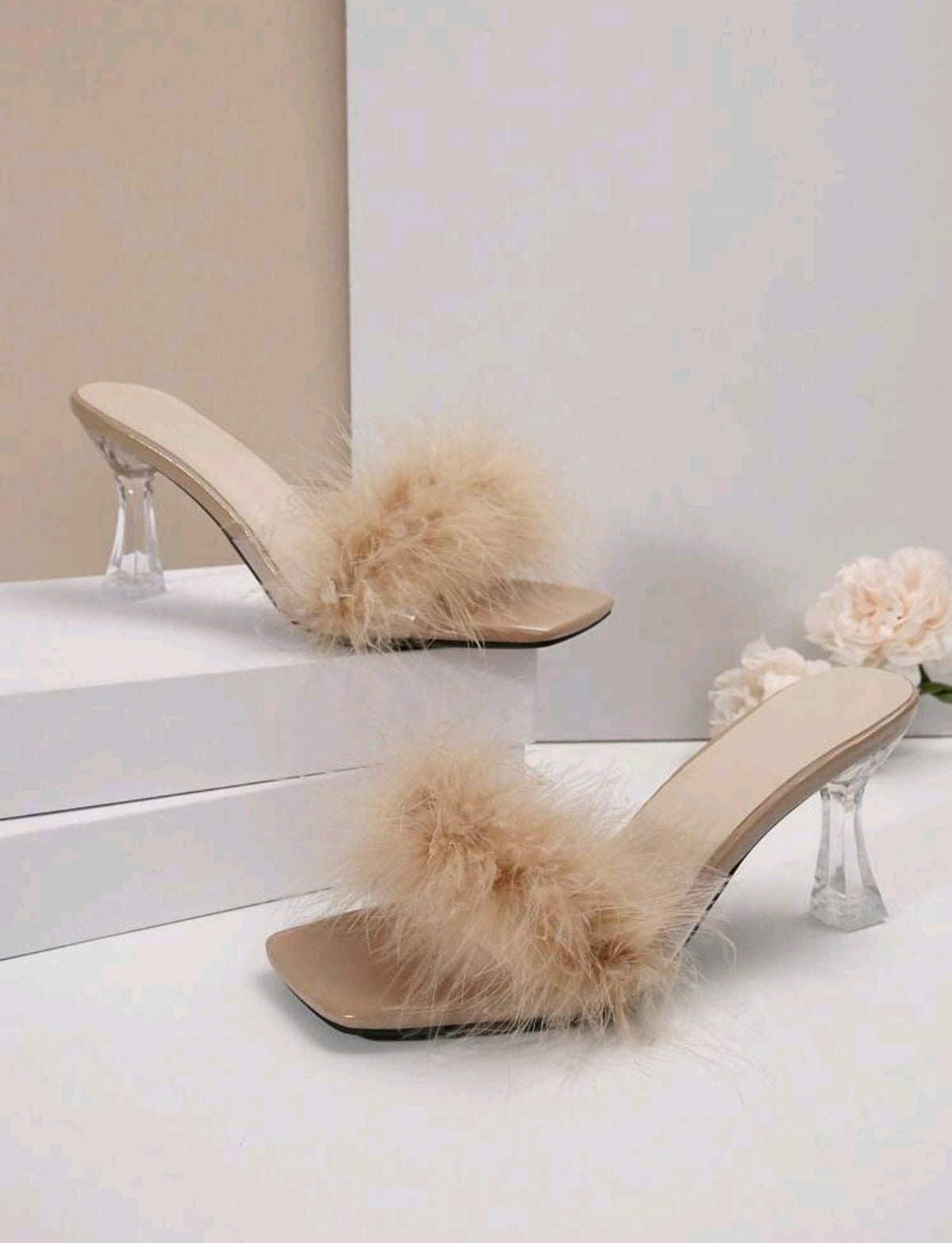 Címke nélküli, elegáns bézs színű papucs, puha tollpánttal és különleges, átlátszó kúp alakú sarokkal. A modern dizájn és a játékos részletek tökéletesen ötvözik a kényelmet és a stílust. Ideális választás alkalmakra, bulikra vagy különleges megjelenéshez.