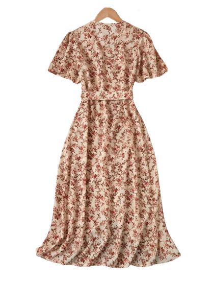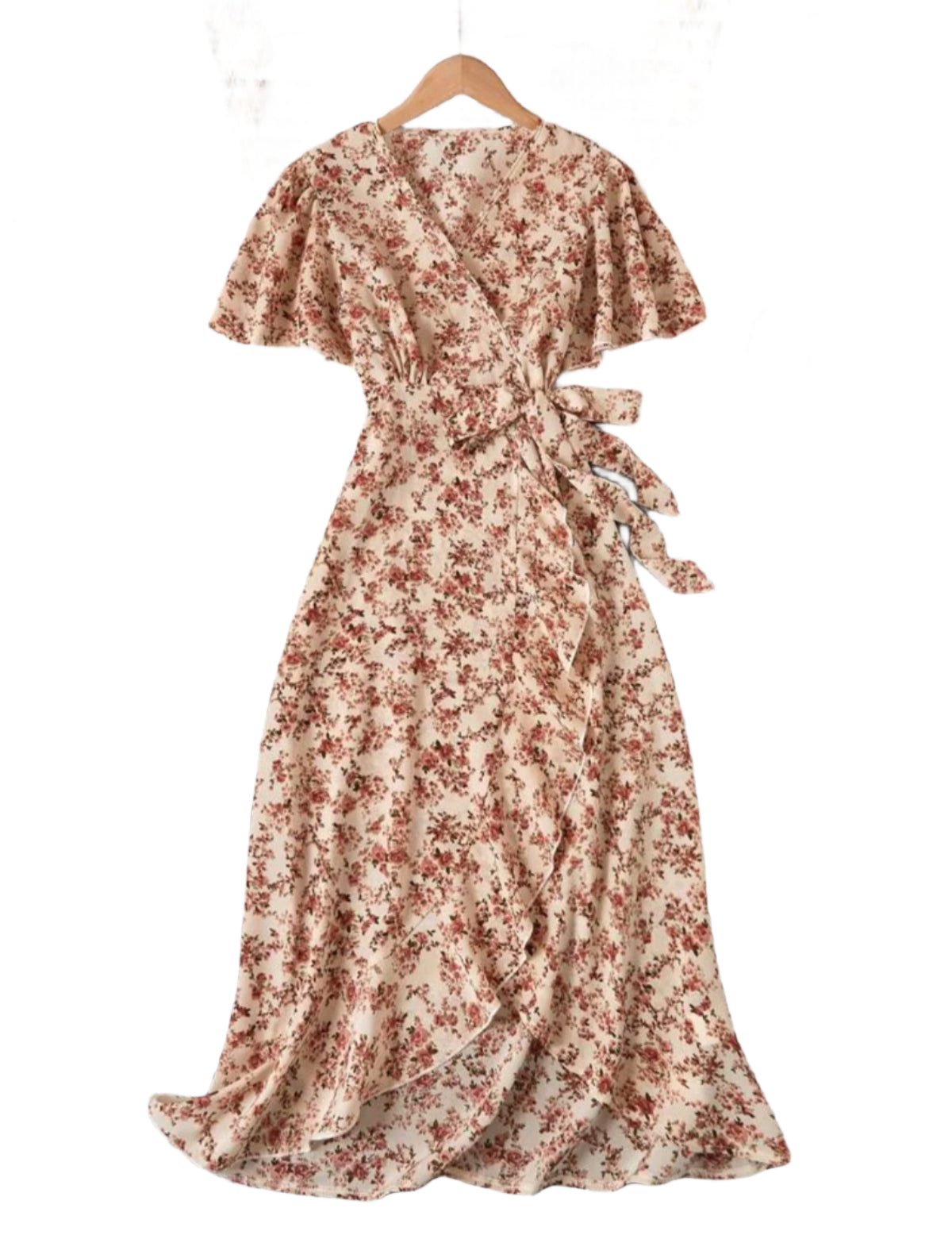 Címke nélküli, könnyed esésű, bézs alapszínű maxi ruha apró bordó virágmintával. Átlapolt fazon, deréknál megköthető övvel, rövid bő ujjakkal és enyhén fodros szegéllyel. Tökéletes nyári napokra, sétákhoz, piknikekhez vagy akár tengerparti vacsorához.