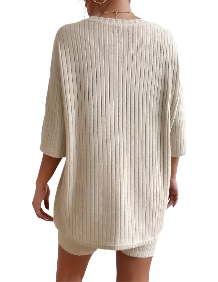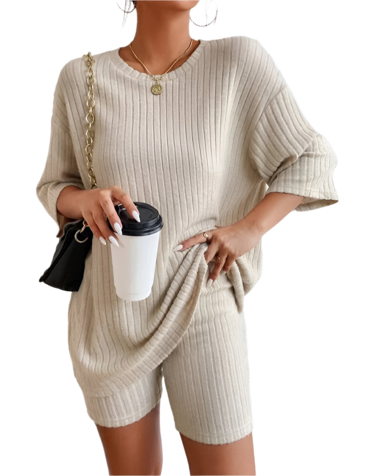 Címke nélküli, kényelmes és stílusos szett, amely egy laza fazonú, bordázott mintázatú felsőből és egy magas derekú, térd fölé érő rövidnadrágból áll. A puha, rugalmas anyag kellemes viseletet biztosít, tökéletes otthoni pihenéshez, városi sétákhoz vagy laza hétköznapi outfitekhez.