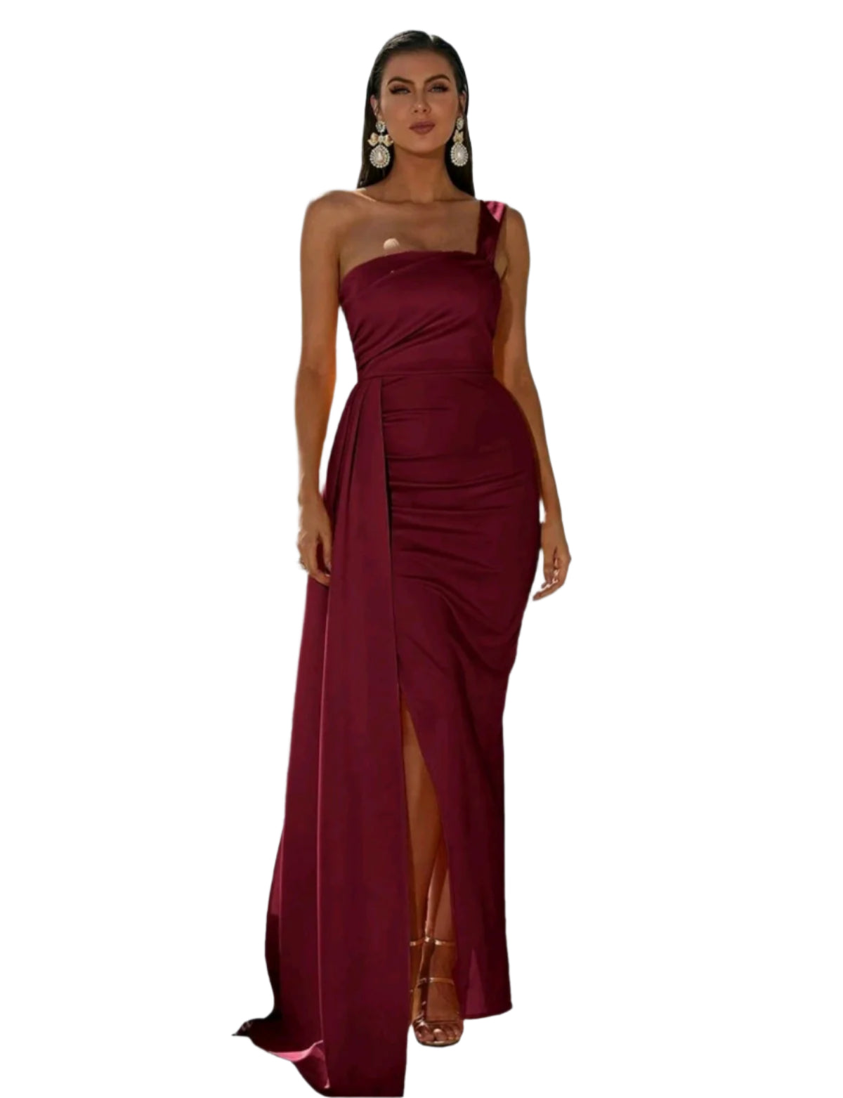 Címke nélküli, elegáns bordó estélyi ruha, amely lenyűgöző megjelenést biztosít. Egyvállas, aszimmetrikus kialakítása modern és kifinomult stílust kölcsönöz. A szűkített szabás kiemeli az alakot, míg a magas slicc nőies és magabiztos megjelenést biztosít. Tökéletes választás esküvőkre, bálokra, elegáns eseményekre és különleges alkalmakra.