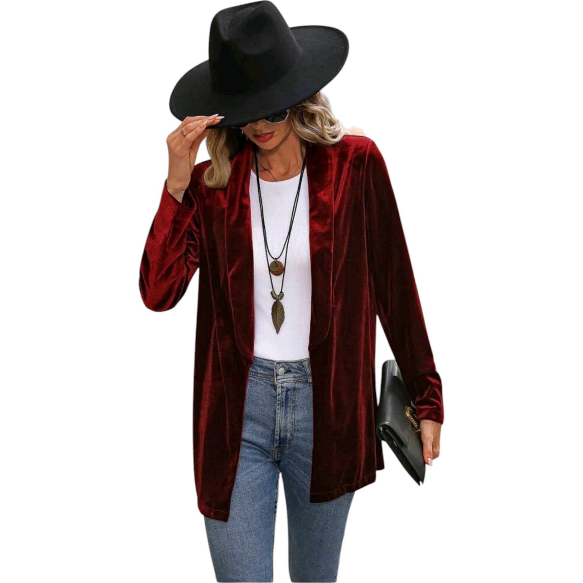 Címke nélküli, bordó, bársony, nyitott fazonú blézer.