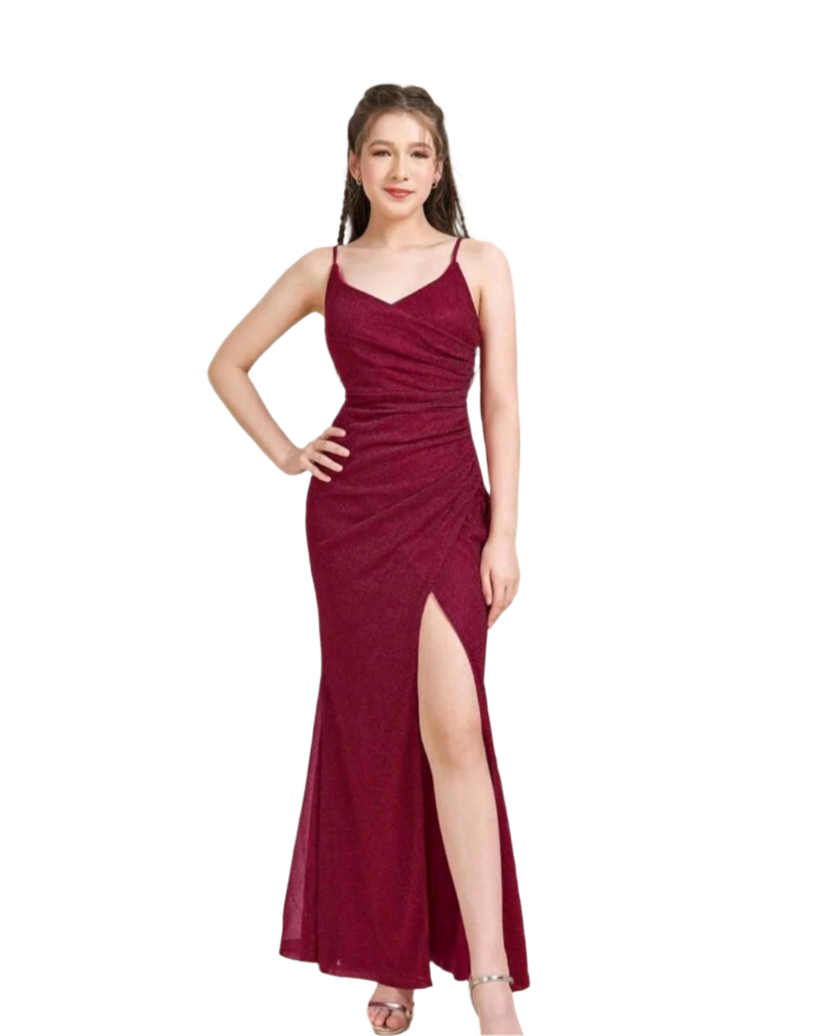 Címke nélküli, csillogó anyagú, testhez simuló szabású alkalmi maxiruha. Vékony vállpántos kialakítása és a V-nyakkivágás elegáns megjelenést biztosít, míg a combig felhasított szoknyarész nőies és különleges megjelenést kölcsönöz. Tökéletes választás bálokra, esküvőkre vagy ünnepi eseményekre.