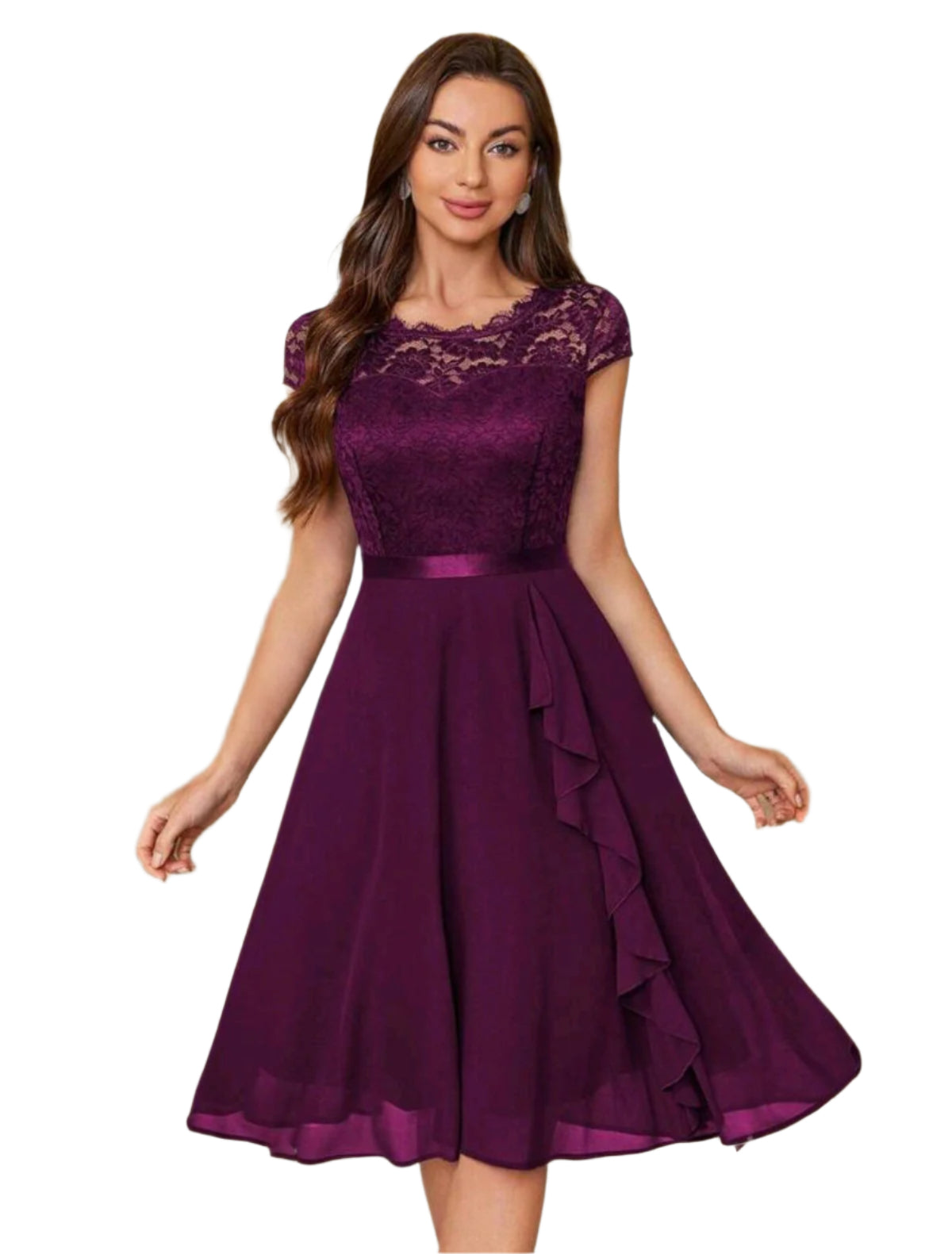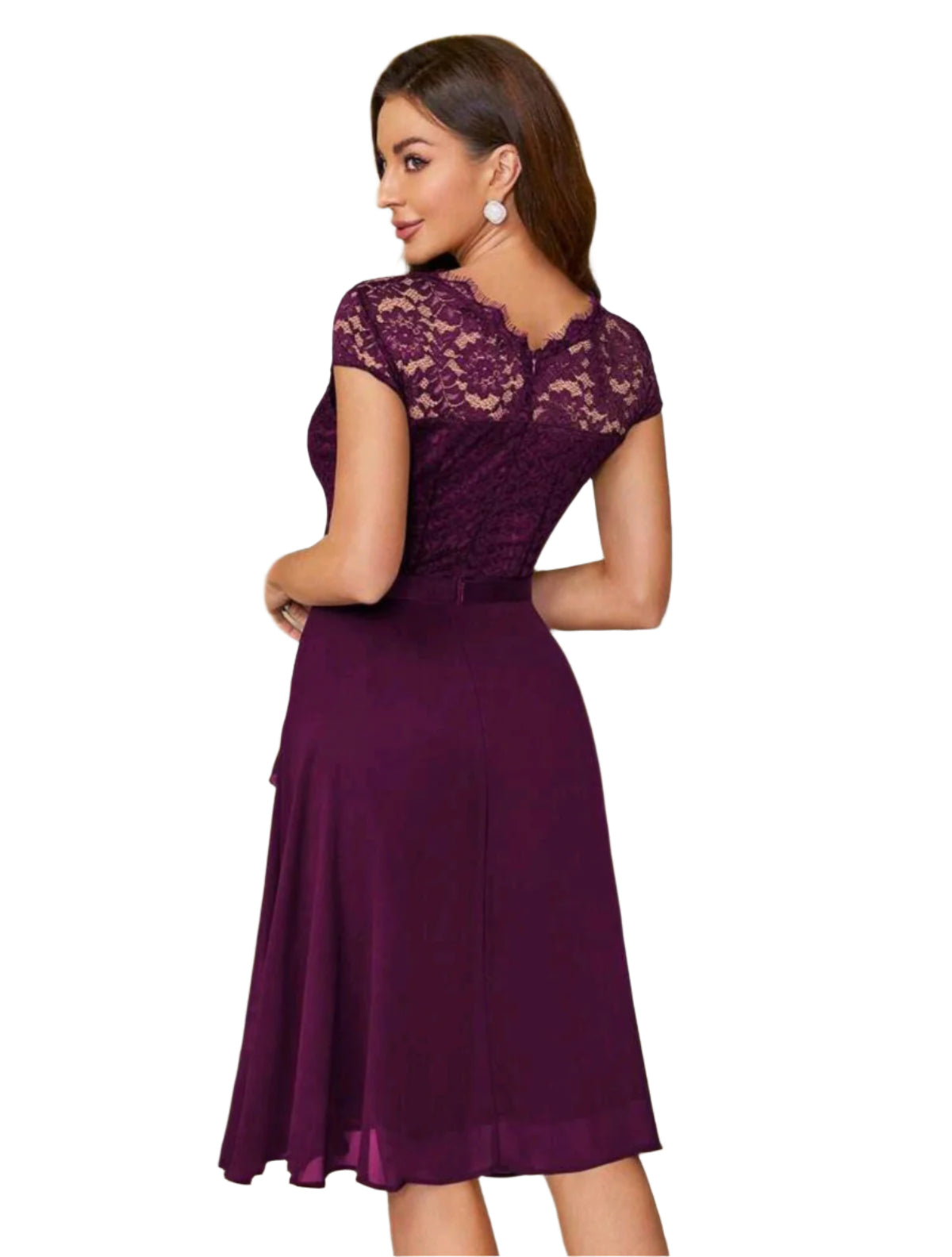 Címke nélküli, elegáns bordó midi ruha csipkés felsőrésszel és rövid ujjakkal. Karcsúsított derékrész szatén övvel, valamint könnyed, rétegezett szoknyarésszel és finom fodorral az oldalán. Kiváló választás esküvőkre, bálokra vagy más különleges alkalmakra.