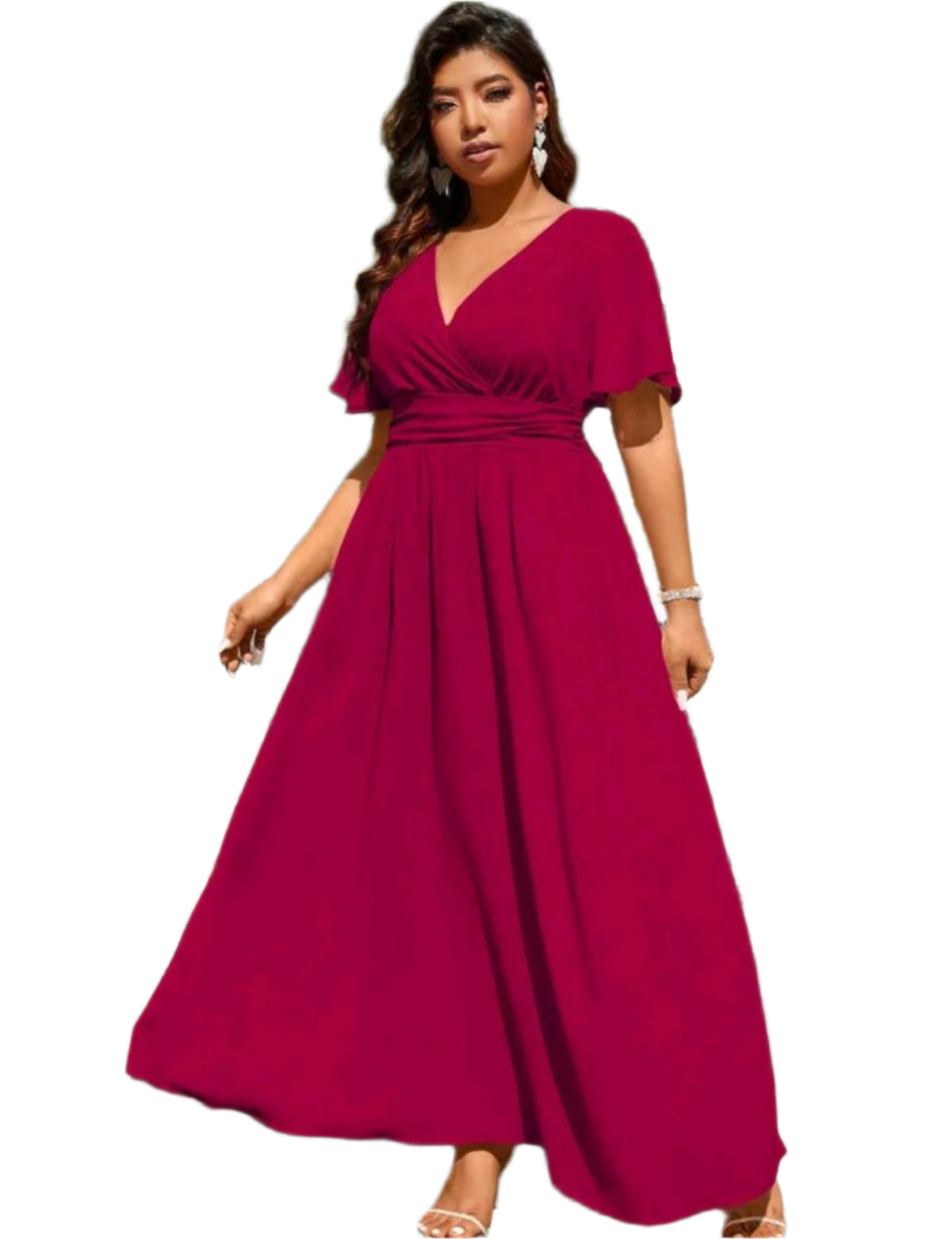 Címke nélküli, könnyed esésű sifon anyagból készült maxi ruha V-nyakkivágással, rövid, fodros ujjal és derékhangsúlyos szabással. A ruha klasszikus fazonja eleganciát sugároz, ideális választás esküvőre, ünnepi alkalmakra vagy elegáns rendezvényekre.