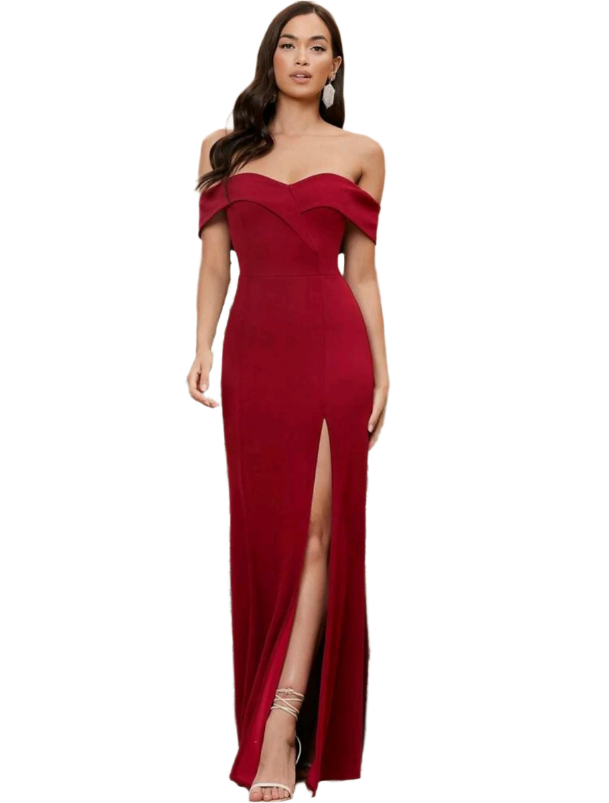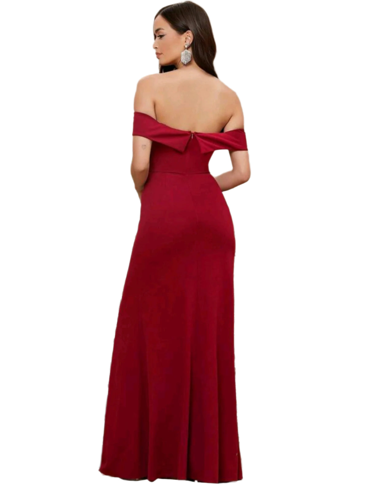 Címke nélküli, testhezálló szabású, váll nélküli maxi ruha elegáns bordó színben. Puha, rugalmas anyagból készült, enyhén szív alakú nyakkivágással és combközépig érő magas sliccel, amely kiemeli a nőies vonalakat. Kiváló választás esküvőre, alkalmi eseményekre vagy egy különleges estére.