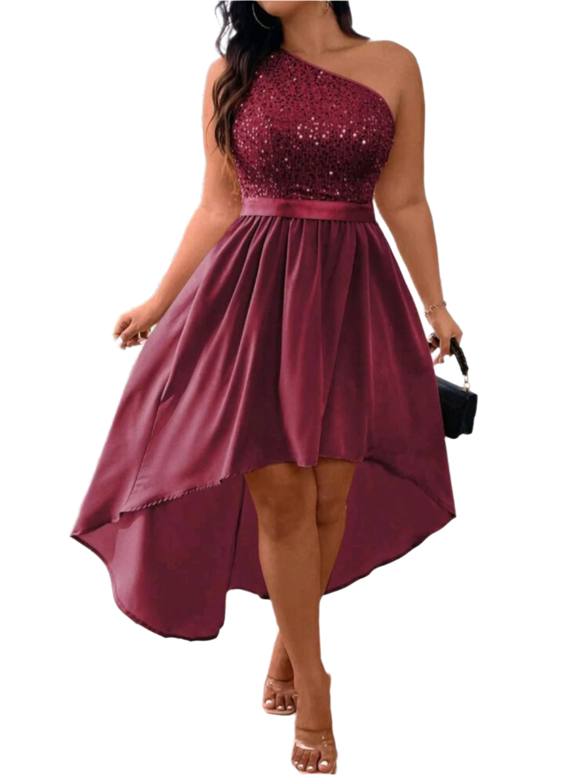 Címke nélküli, flitteres felsőrésszel és egypántos kialakítással ellátott bordó ruha. A derékban megkötött szatén szalag kiemeli az alakot, míg az aszimmetrikus szoknyarész elegáns és játékos megjelenést biztosít. Tökéletes választás esküvőre, estélyre vagy bármilyen különleges alkalomra.