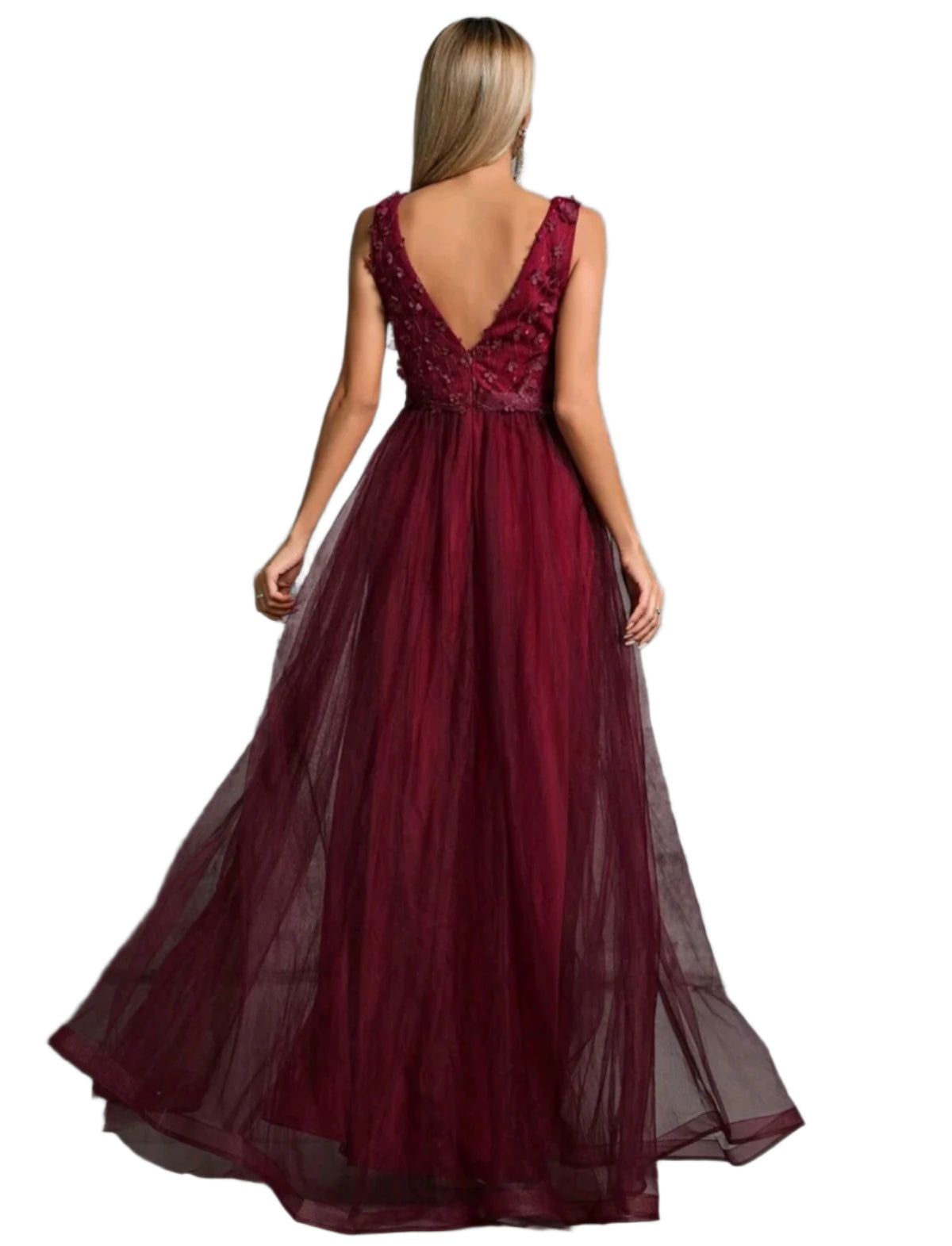 Címke nélküli, bordó színű, mély V-nyakkivágású, ujjatlan maxi ruha hímzett felsőrésszel és légies tüll szoknyarésszel. Magas sliccelése elegánsan megmutatja a lábat, míg a karcsúsított fazon kiemeli a nőies vonalakat. Tökéletes választás esküvőre, bálra vagy más ünnepi alkalomra.